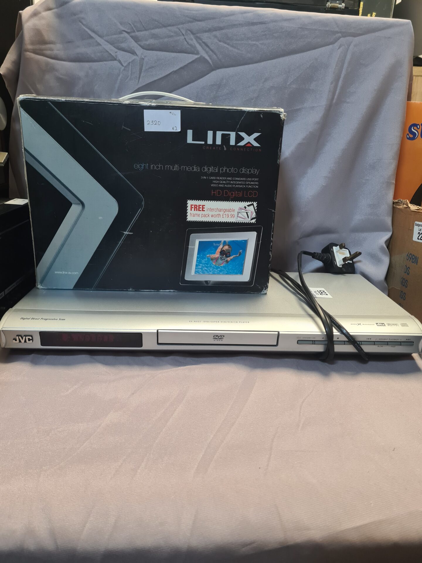 This lot features a JVC DVD player paired with a Linx eight-inch multimedia digital photo display. The combination offers both traditional DVD playback and the ability to view digital photos, potentially offering a versatile entertainment solution. The Linx display is integrated with the DVD player, creating a compact all-in-one unit.