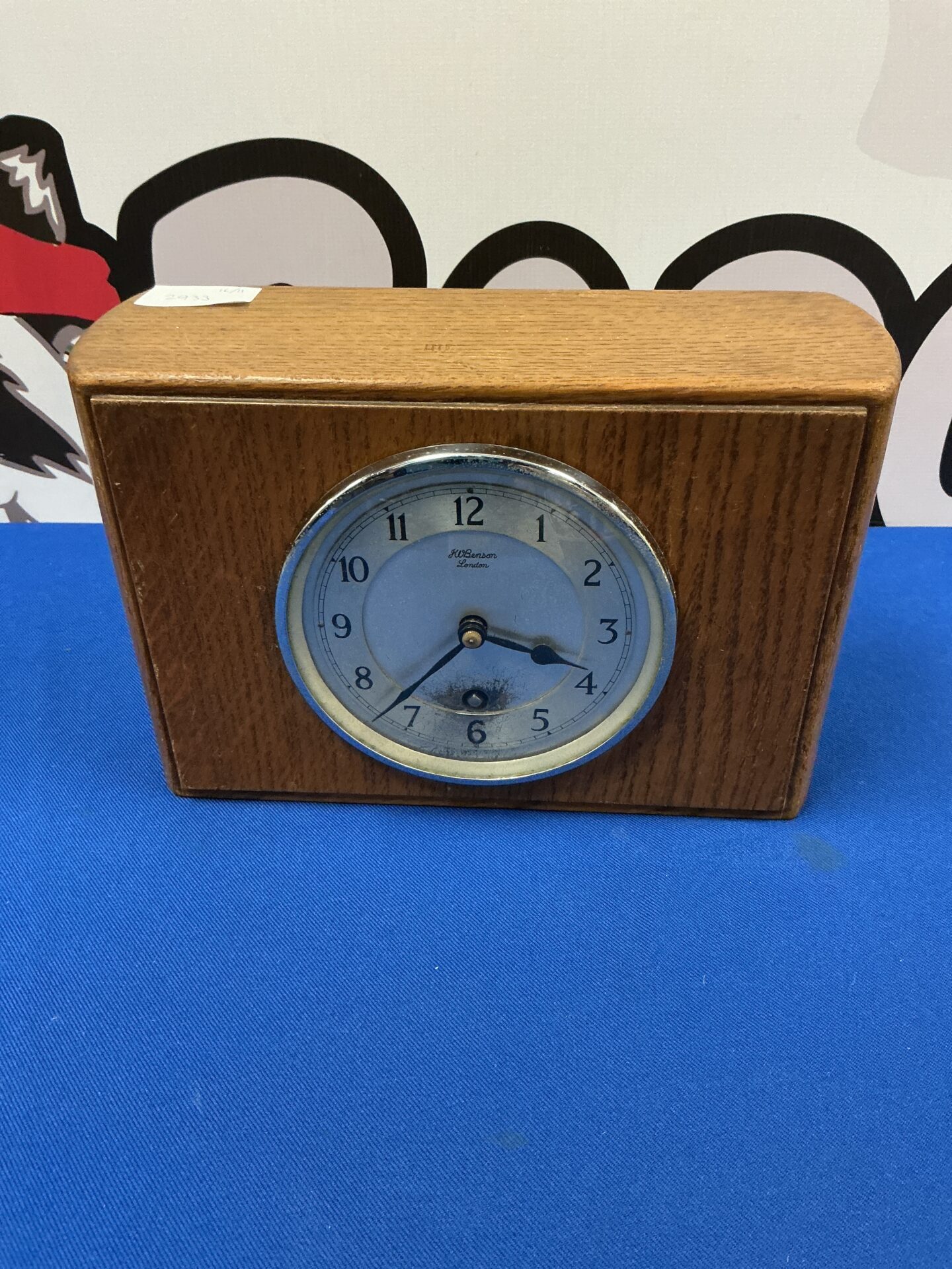 This is a JW Benson mantle clock, presented in a wooden case. The clock face features black Roman numerals and ornate hands, typical of the style favoured by Benson. The clock is designed to sit on a mantelpiece or similar flat surface, offering both timekeeping and decorative appeal.