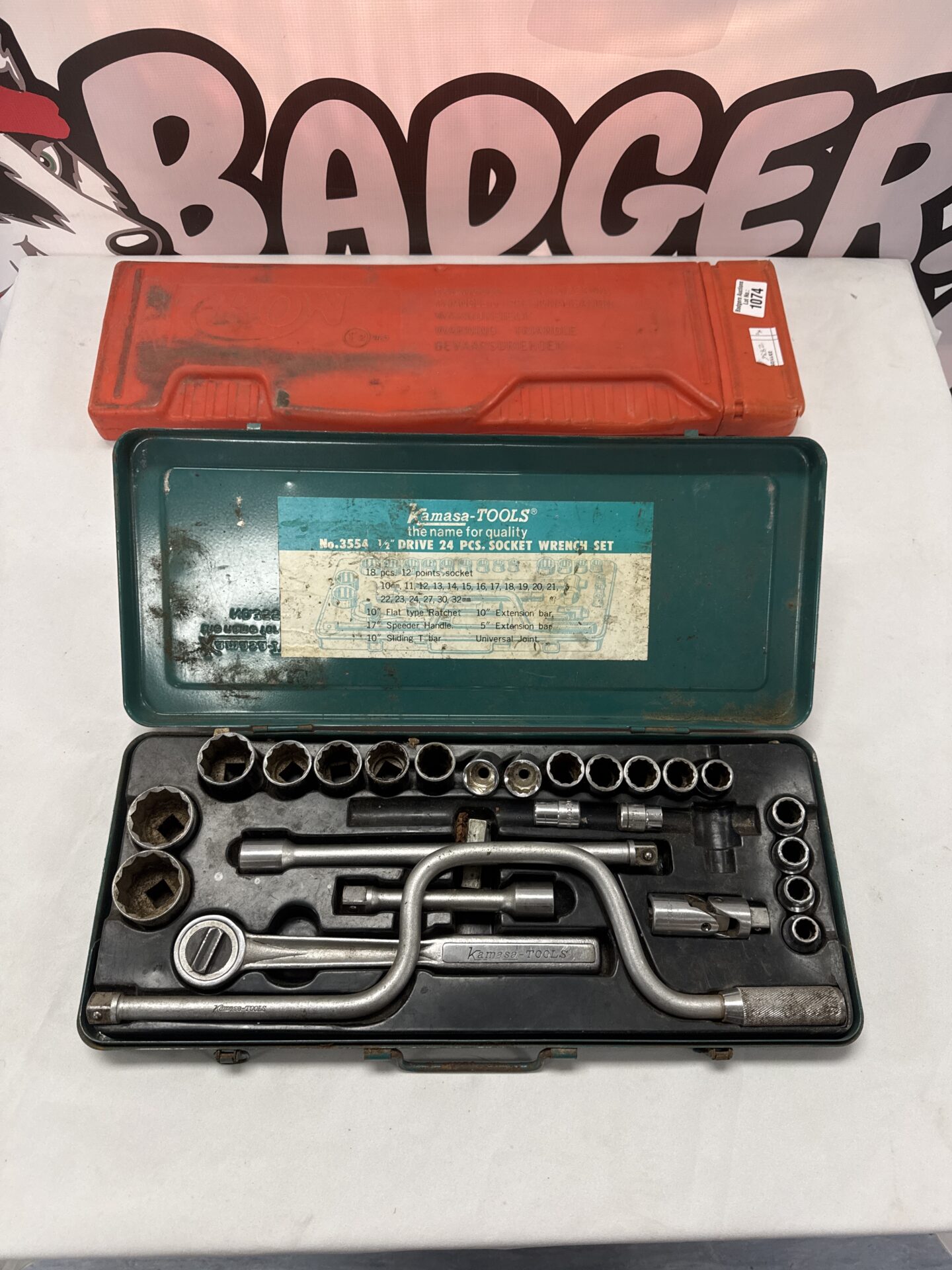 This is a Kamasa 1/2” drive socket set, model number 2554. The set is contained within its original cardboard box, displaying the Kamasa branding. It appears to be a comprehensive set for its time, designed for general mechanical work and maintenance. The box shows signs of age and wear, consistent with a vintage tool set.