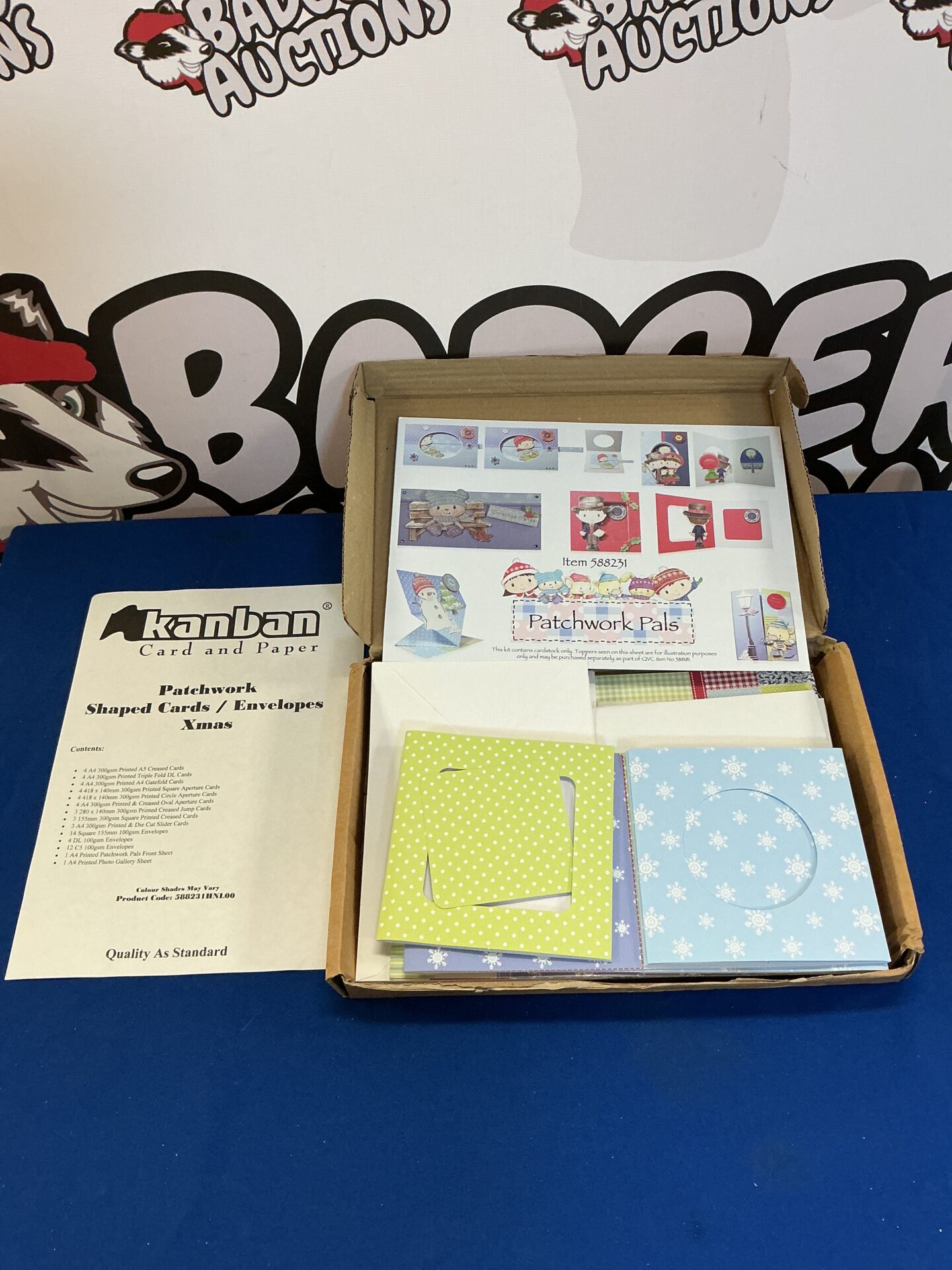 This is a Kanban Patchwork Pals Christmas card crafting kit, model number 88231. The kit contains materials for creating shaped Christmas cards with a charming patchwork design. It appears to be a complete kit for handmade card making, offering a creative activity for crafting enthusiasts.