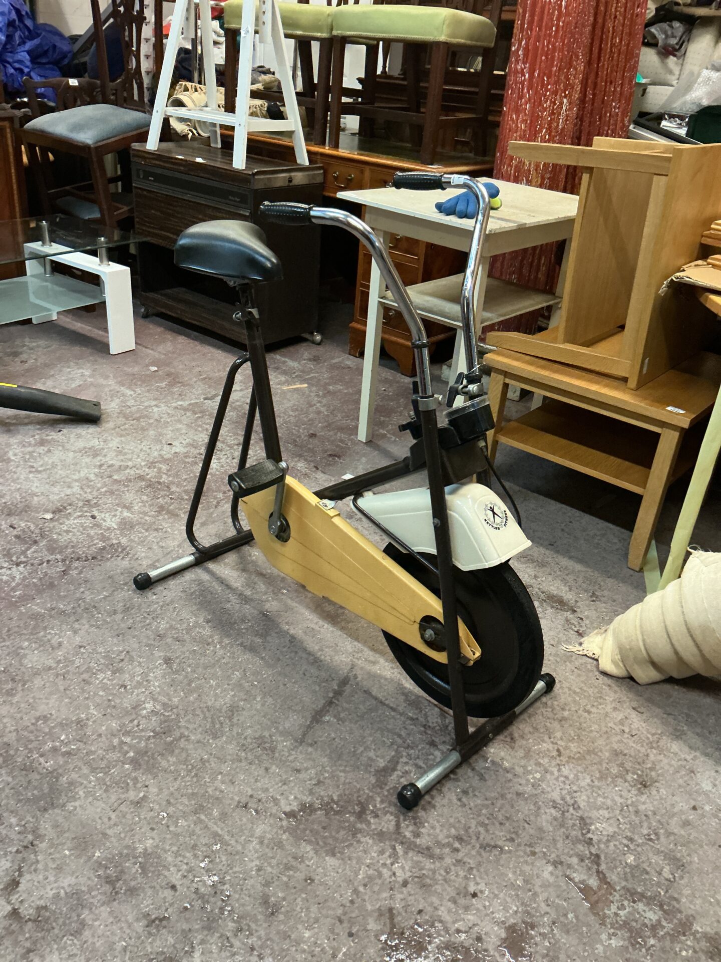 This is a Keller Fitness Bike, a stationary exercise machine designed for home use. The bike features a simple, upright design with a padded seat and adjustable resistance. Its construction appears to be primarily metal, offering a sturdy frame for exercise. The bike’s aesthetic is typical of fitness equipment from its era, prioritizing functionality over elaborate styling.