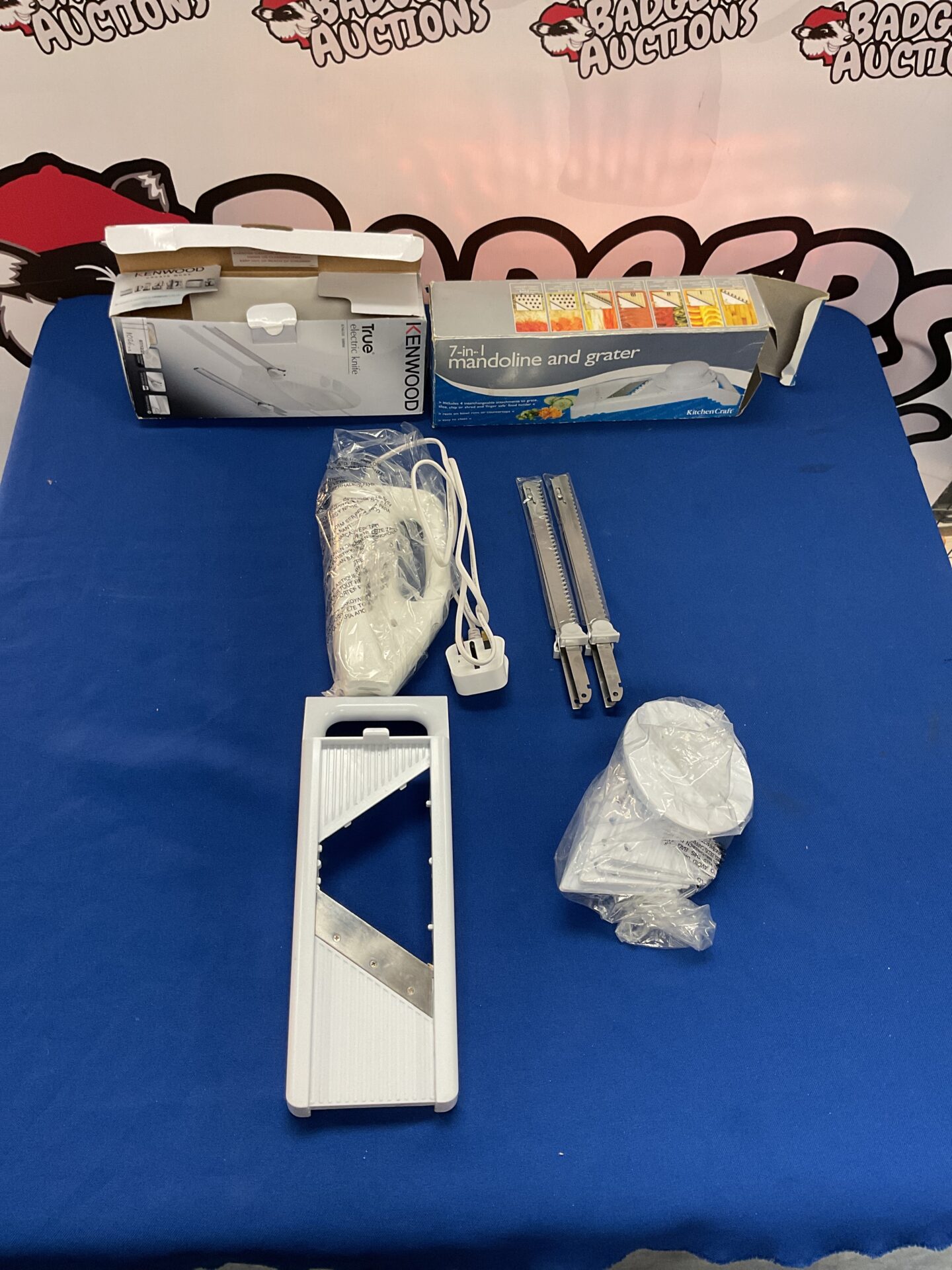 This lot features a Kenwood food slicer, part of a 7-in-1 system, and includes an electric knife. The slicer is designed for versatile food preparation, offering various slicing and grating options. The inclusion of the electric knife expands its functionality, making it suitable for carving meats and other foods.