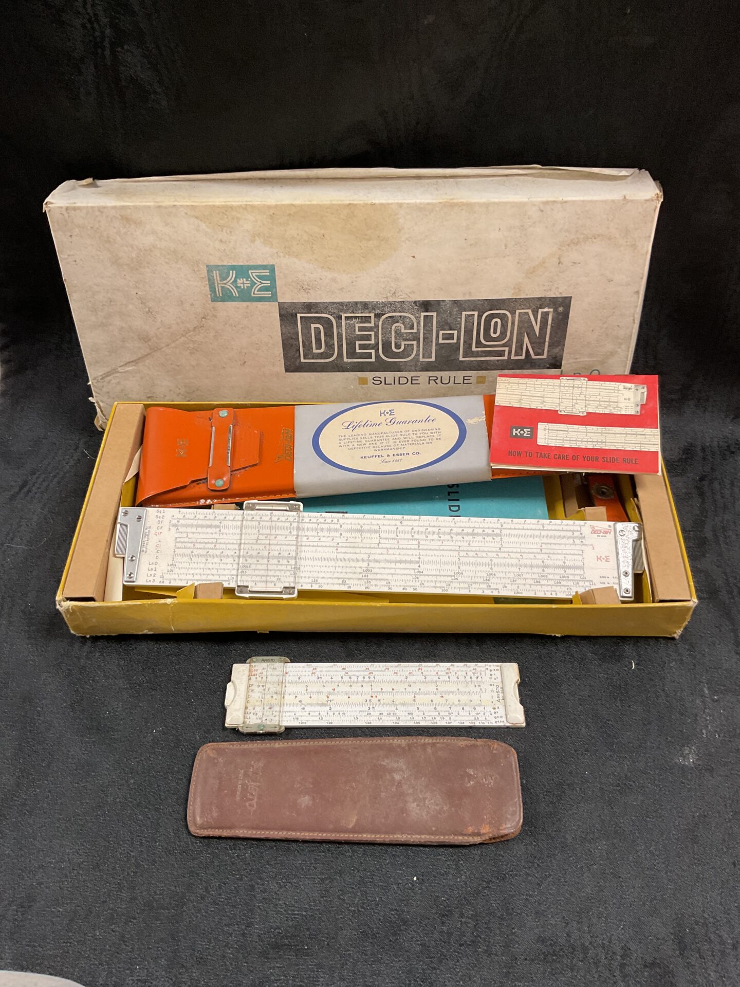 This is a KEUFFEL & ESSEN DECI-LON slide rule, a precision instrument used for multiplication, division, logarithms, trigonometry, and other complex calculations. The Decilon model is known for its accuracy and durability, making it a favourite among engineers, scientists, and mathematicians for decades. This particular example comes complete with its original box and a pocket aristo slide rule, adding to its collectibility and usability.