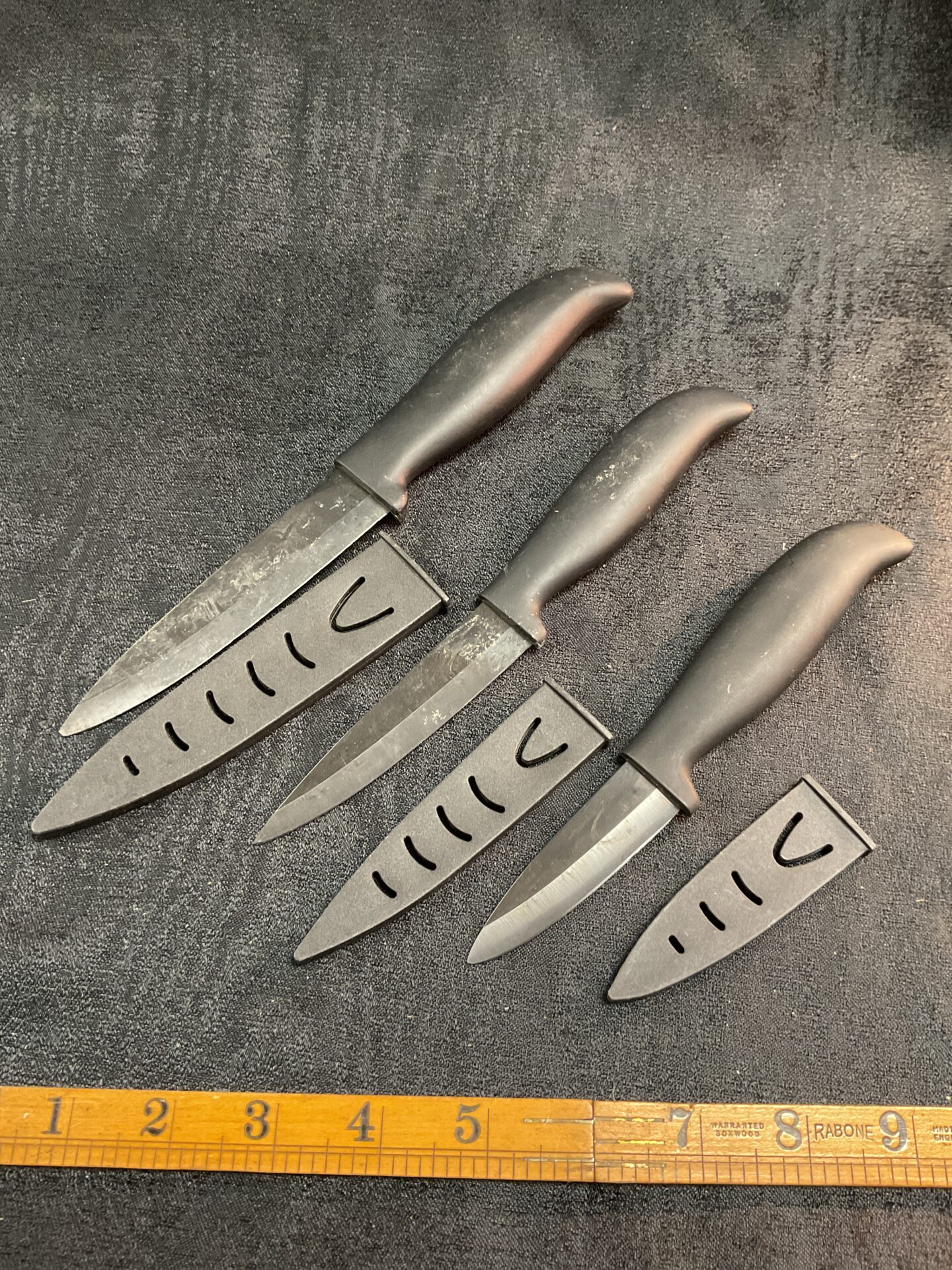 This lot comprises three kitchen knives, each featuring a stainless steel blade and a dark-coloured handle. The blades exhibit a pointed tip, suggesting their use for precision cutting tasks. The handles appear to be constructed from a durable material, providing a secure grip during use.
