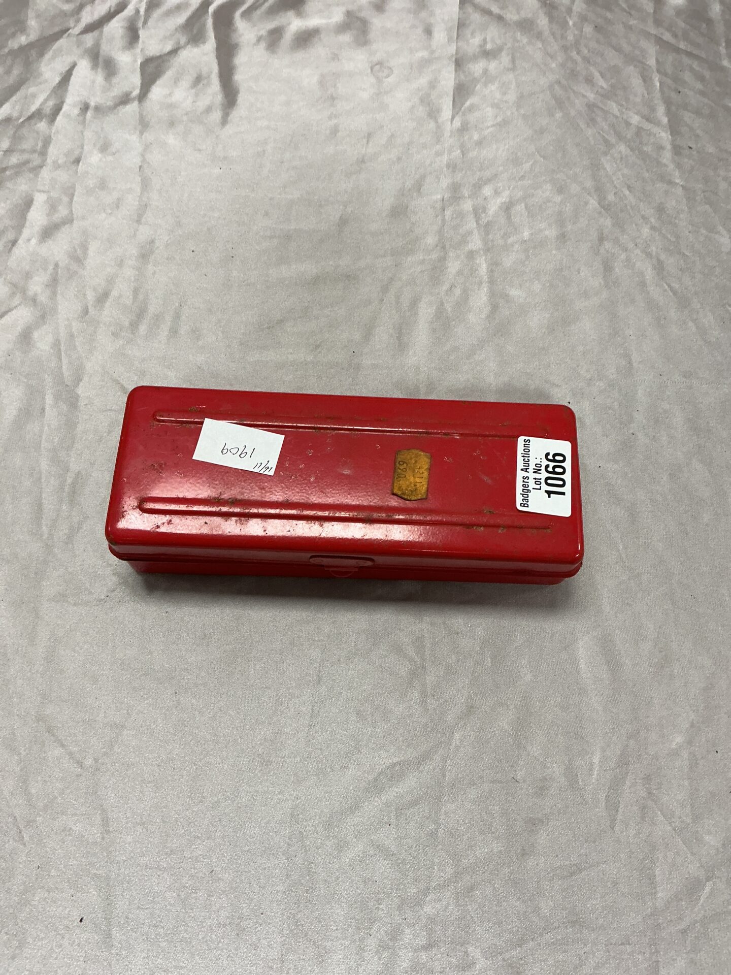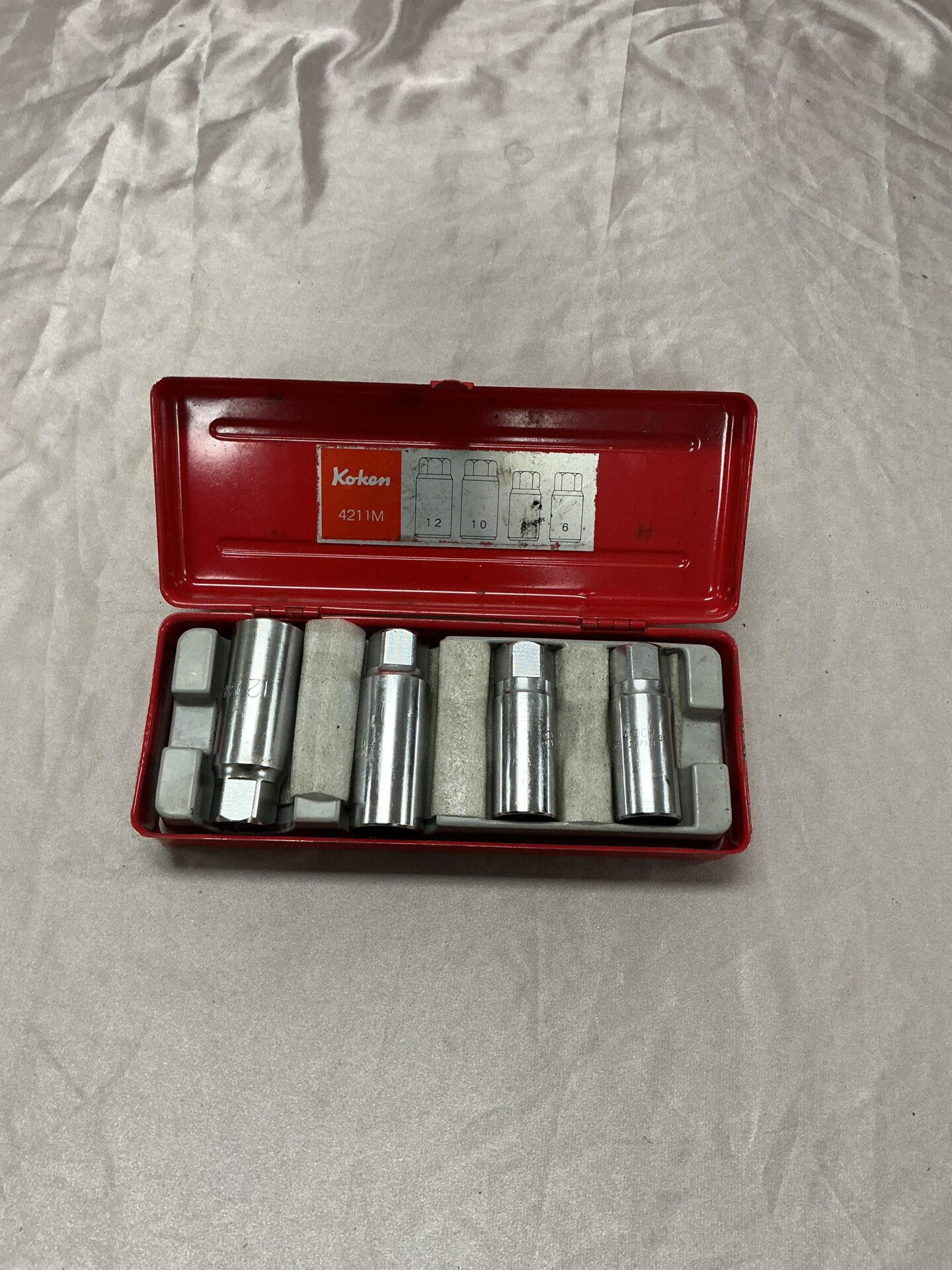 This set appears to be in used condition, with some signs of wear consistent with age and use. The case shows some scuffs and marks, and the sockets may exhibit minor wear on the drive ends. This set would be of interest to collectors of vintage tools, automotive enthusiasts, or mechanics looking for a classic set of stud sockets.