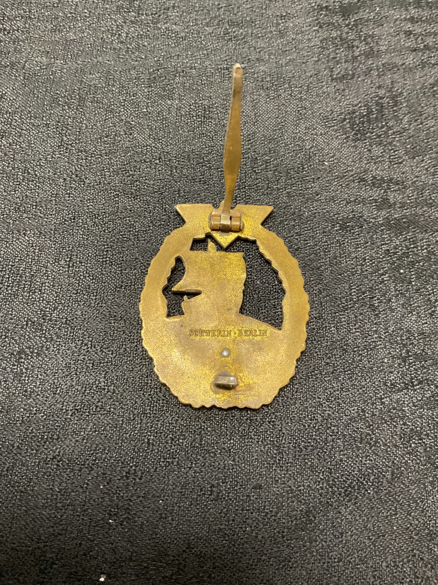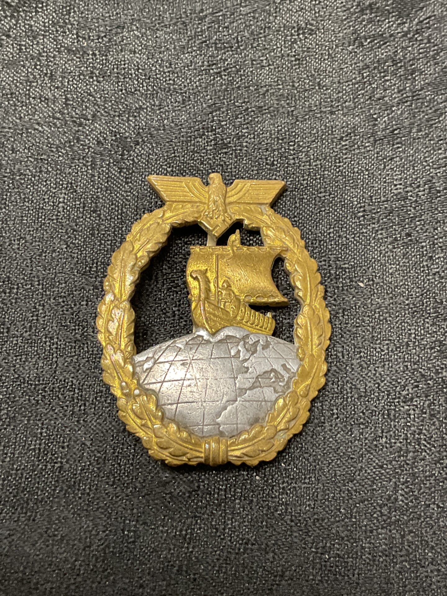 This badge exhibits signs of age and wear consistent with its historical period. While the badge shows some patina and minor wear to the gilt finish, it remains a visually striking example of WWII German naval insignia. This badge would be of interest to collectors of military memorabilia, particularly those specialising in WWII German naval items or badges.
