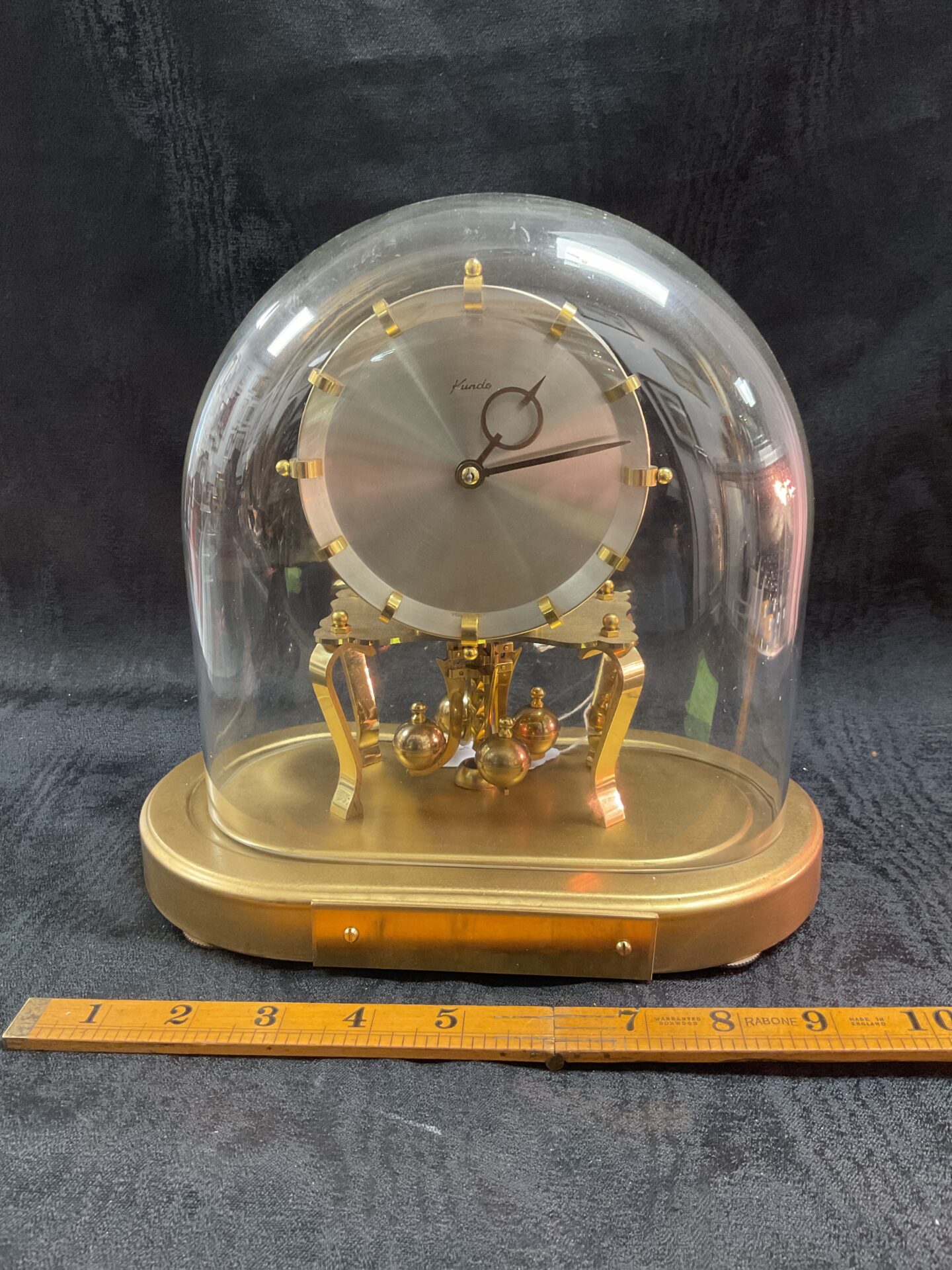 This vintage Kundo anniversary clock by Kieninger and Obergfell features a beautiful glass dome and brass-toned torsion pendulum. The clock is in working order and showcases German craftsmanship. A perfect addition to any collection or as a unique mantlepiece display.