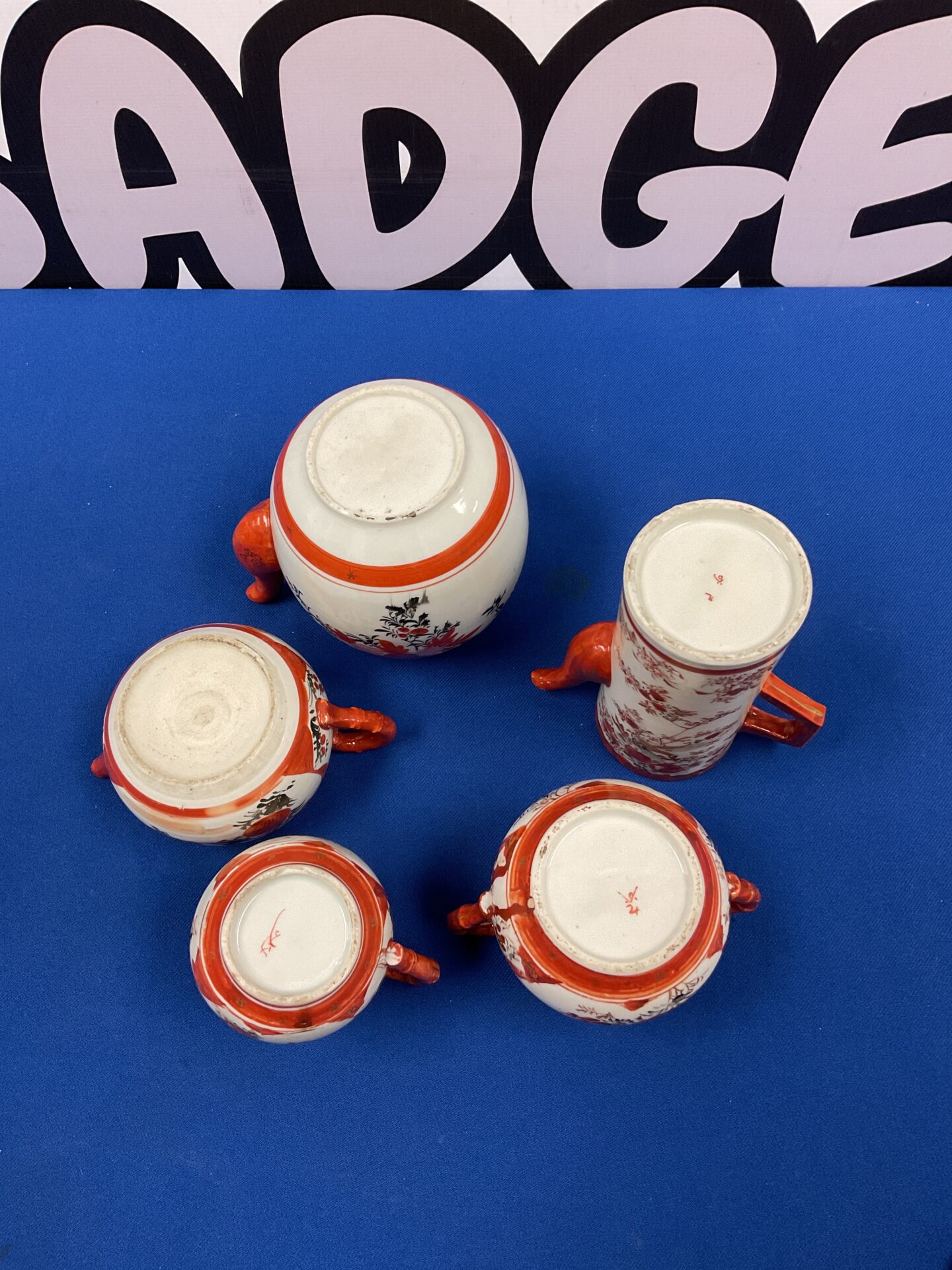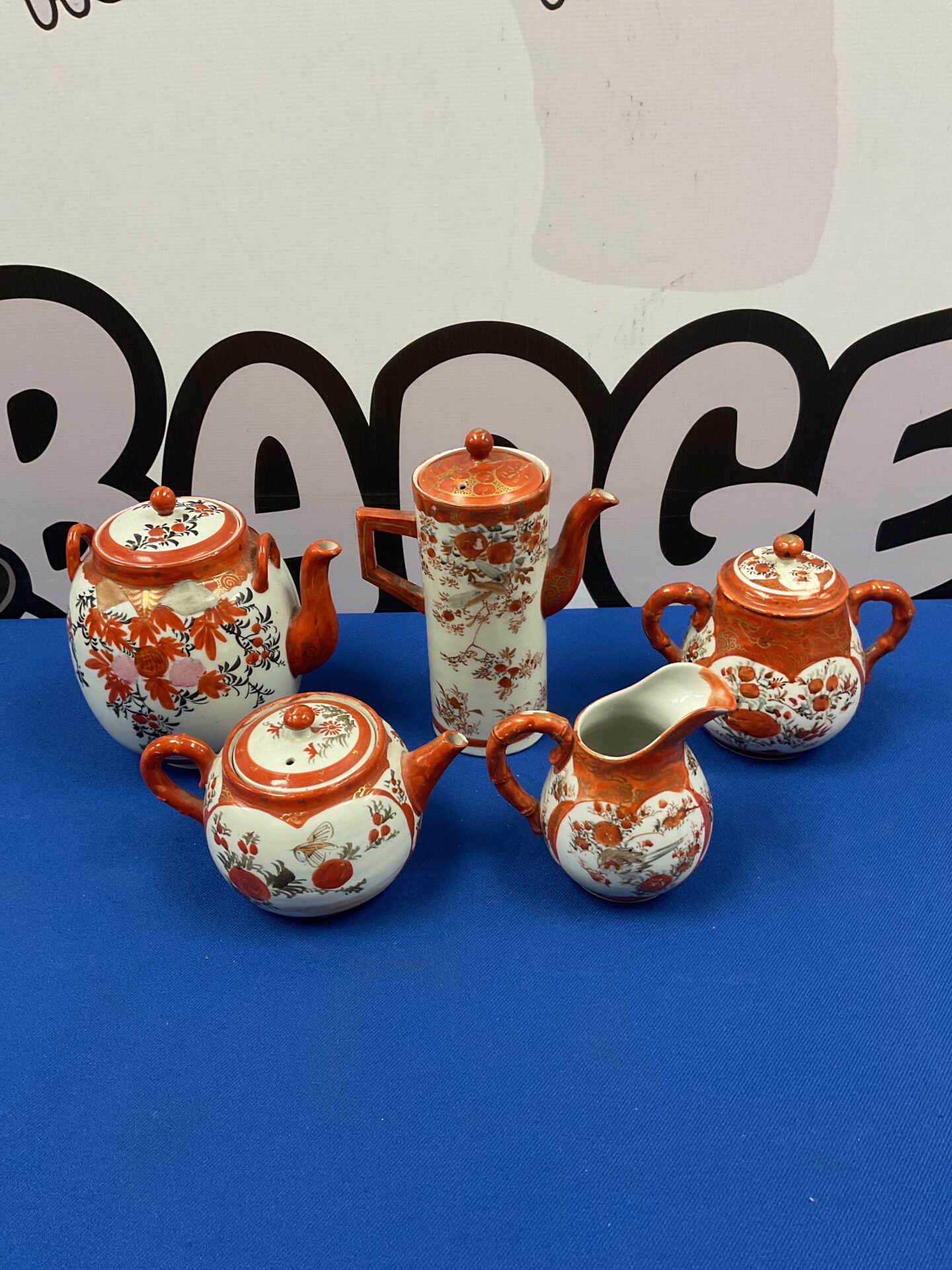This charming collection comprises five pieces of exquisitely crafted Kutani porcelain. The set includes a larger teapot, a smaller teapot, a creamer, and two miniature teapots, all adorned with a vibrant and intricate floral pattern against a white background. The bold red and gold accents characteristic of Kutani ware add a touch of elegance and sophistication. These pieces showcase the fine artistry and meticulous detail for which Kutani porcelain is renowned, originating from the Kutani region of Japan.
