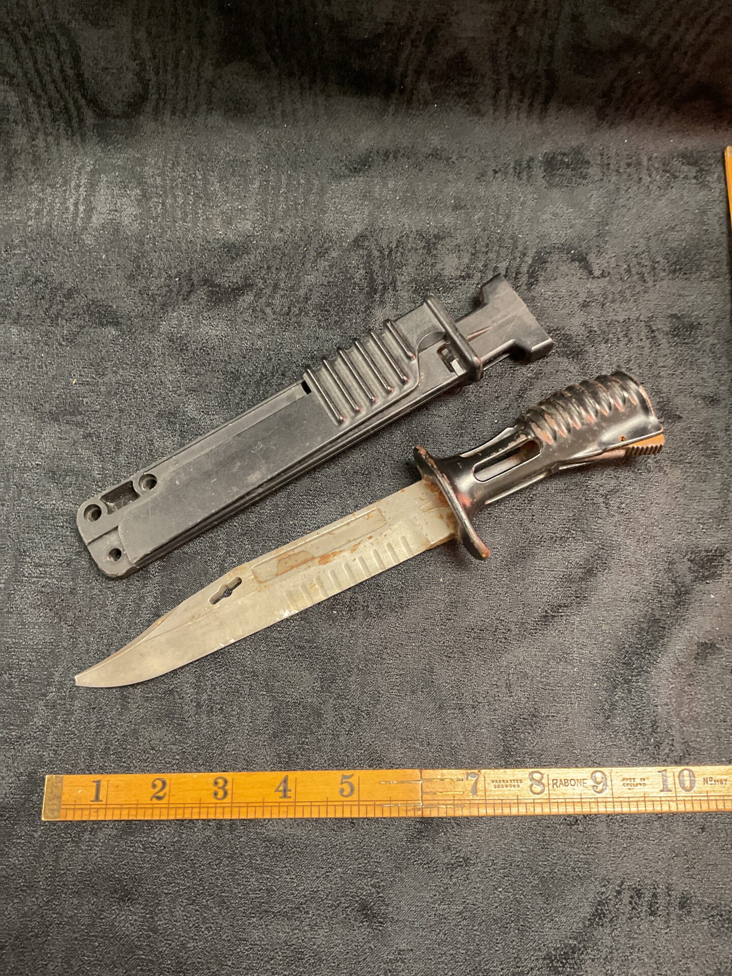 This is a British Army L3A1 bayonet, designed for use with the SA80 rifle. It features a black plastic grip and scabbard, and a steel blade. The bayonet is a standard issue item for the British Armed Forces, and is designed for close-quarters combat and utility purposes. The scabbard features a belt clip for easy attachment to webbing.