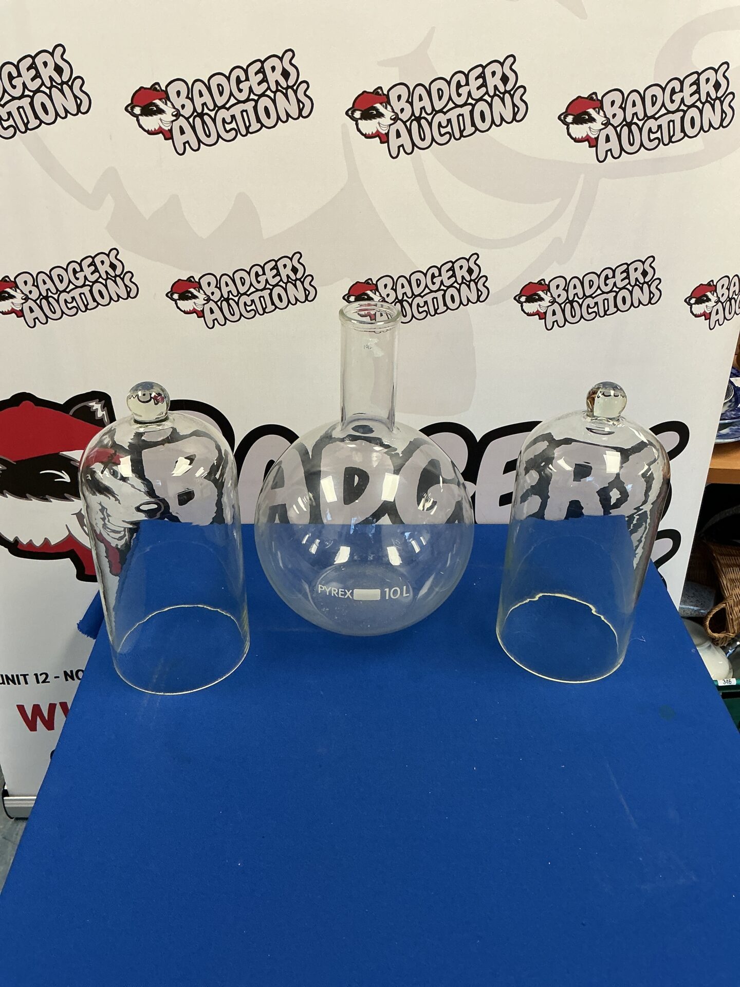 This lot comprises a Pyrex 10L boiling flask accompanied by two bell jars. The flask is constructed from durable borosilicate glass, designed to withstand high temperatures and chemical exposure common in laboratory settings. The bell jars, also crafted from glass, likely served as protective covers for experiments or as part of vacuum systems.