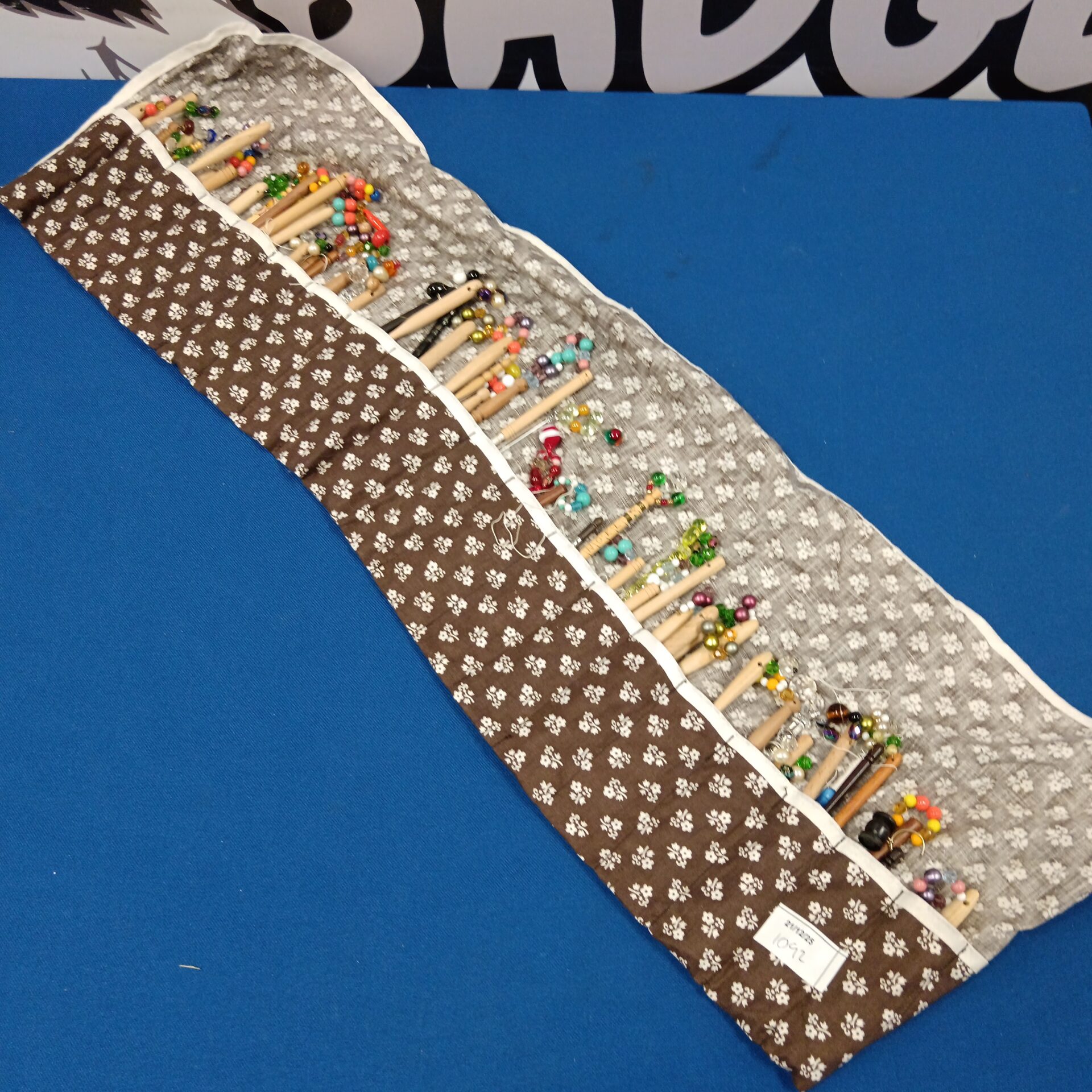 This collection comprises a variety of lace making bobbins, likely used for creating intricate lace patterns. The bobbins are crafted from wood and feature decorative turned details, with some exhibiting painted or coloured ends. They are presented neatly arranged within a protective cloth roll, suggesting careful storage and use.