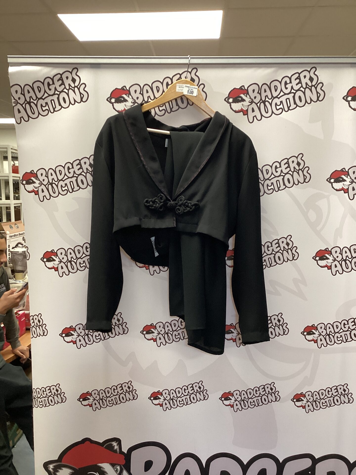 The condition of the garments appears consistent with age and previous use, with some signs of wear visible upon close inspection. These pieces may appeal to collectors of vintage fashion or individuals seeking unique and stylish additions to their wardrobe. The ensemble offers a complete look for formal events, making it a desirable lot for those interested in classic evening wear.