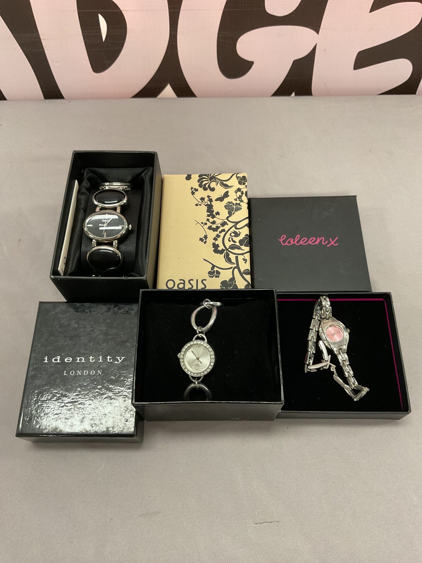 These watches appear to be in good condition, though a detailed inspection would be recommended. The inclusion of the original boxes enhances their appeal to collectors, as does the presence of well-known fashion brands like oasis and identity. This lot offers a great opportunity to acquire a selection of stylish and affordable timepieces.