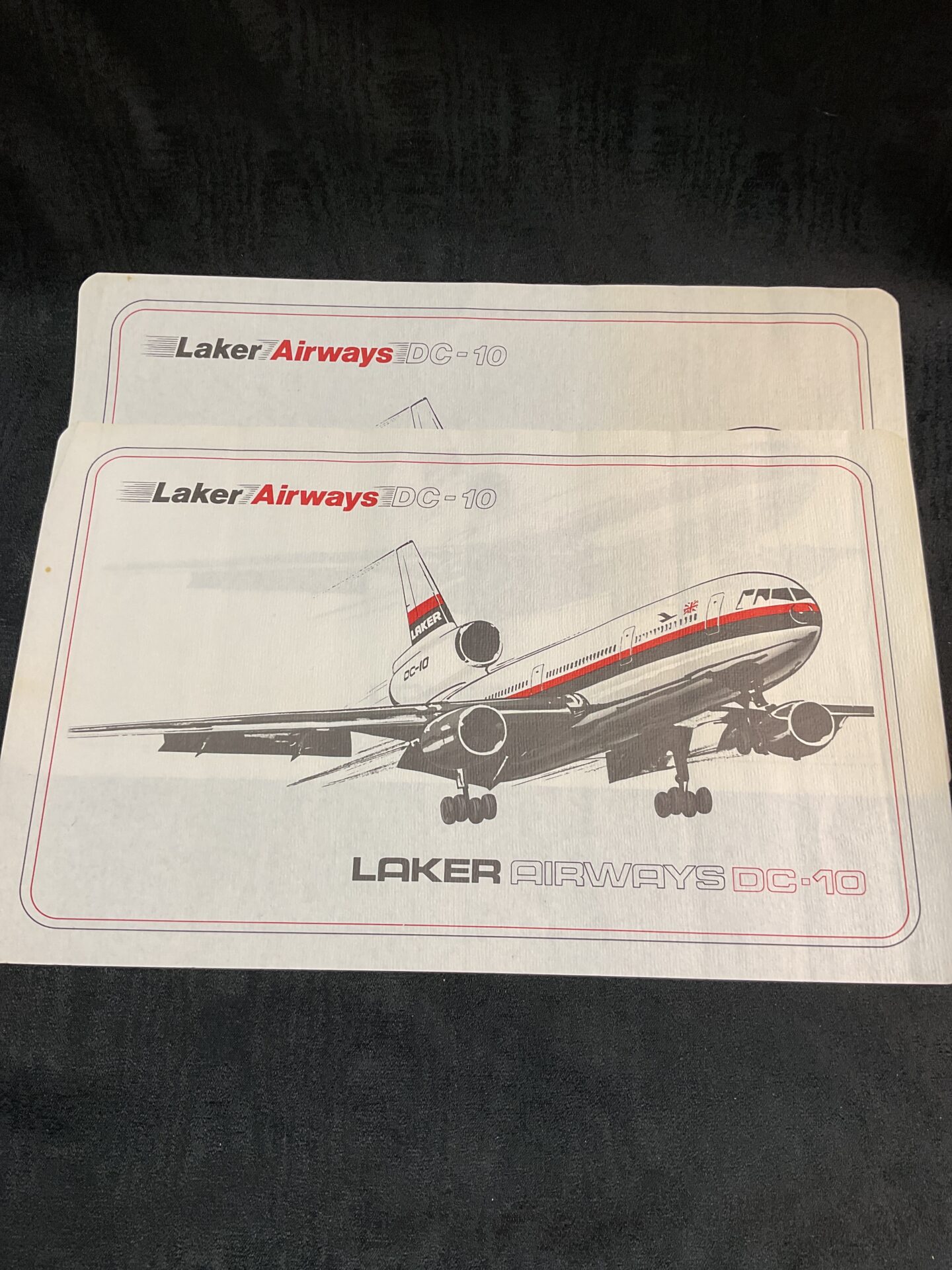 These are a pair of vintage paper tray covers featuring the iconic Laker Airways DC10 aircraft. These covers would have been used on Laker Airways flights, adding a touch of branding to the in-flight dining experience. The design showcases the distinctive Laker Airways livery on a DC10, a popular wide-body jet used for long-haul routes.