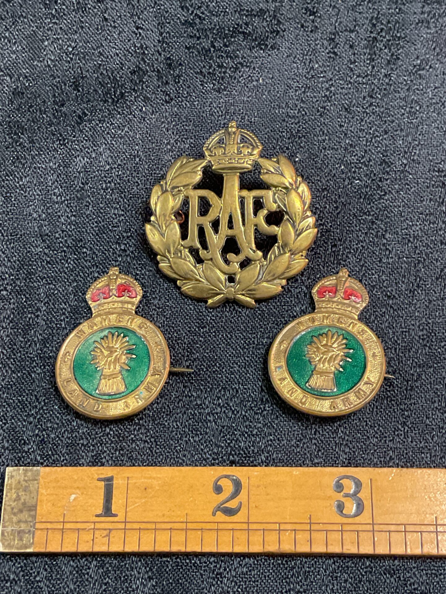 884 Two Ww2 Land Army Pin Badges And Raf Cap Badge