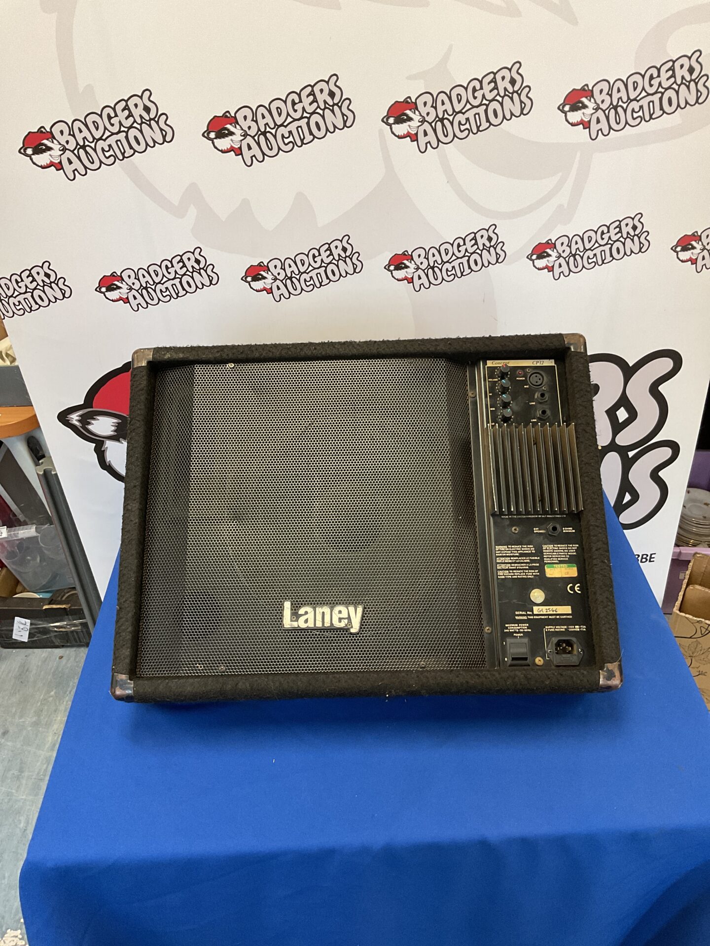 This is a Laney CP12 stage amplifier, a classic amplifier known for its robust build and distinctive sound. The amplifier features a solid construction and is designed for stage performance, offering a powerful and reliable sound. It is a sought-after model among guitarists and collectors alike, appreciated for its vintage aesthetic and tonal qualities.