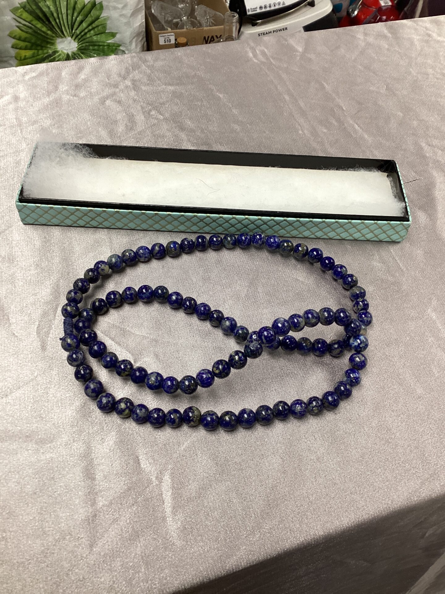 This striking necklace features a string of polished lapis lazuli beads, known for their deep blue hue. A classic and versatile piece, it’s perfect for adding a touch of elegance to any outfit. Ideal for collectors or anyone seeking a beautiful statement necklace.