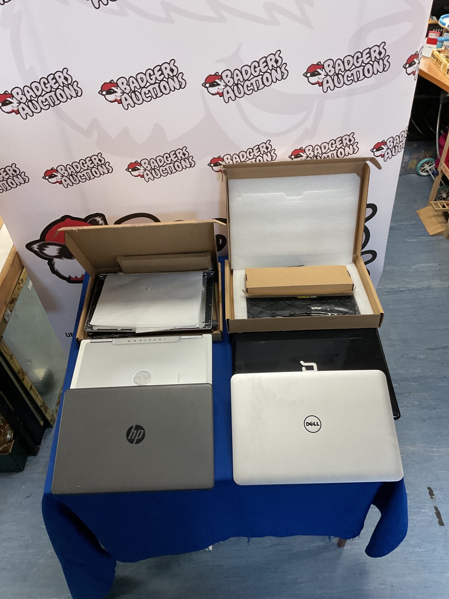 This lot comprises four laptops, including one HP model, alongside a collection of laptop spares. The laptops vary in size and condition, presenting a potential project for repair, refurbishment, or parts harvesting. This bundle offers a diverse range of components and potentially salvageable units for tech enthusiasts or those seeking affordable parts.