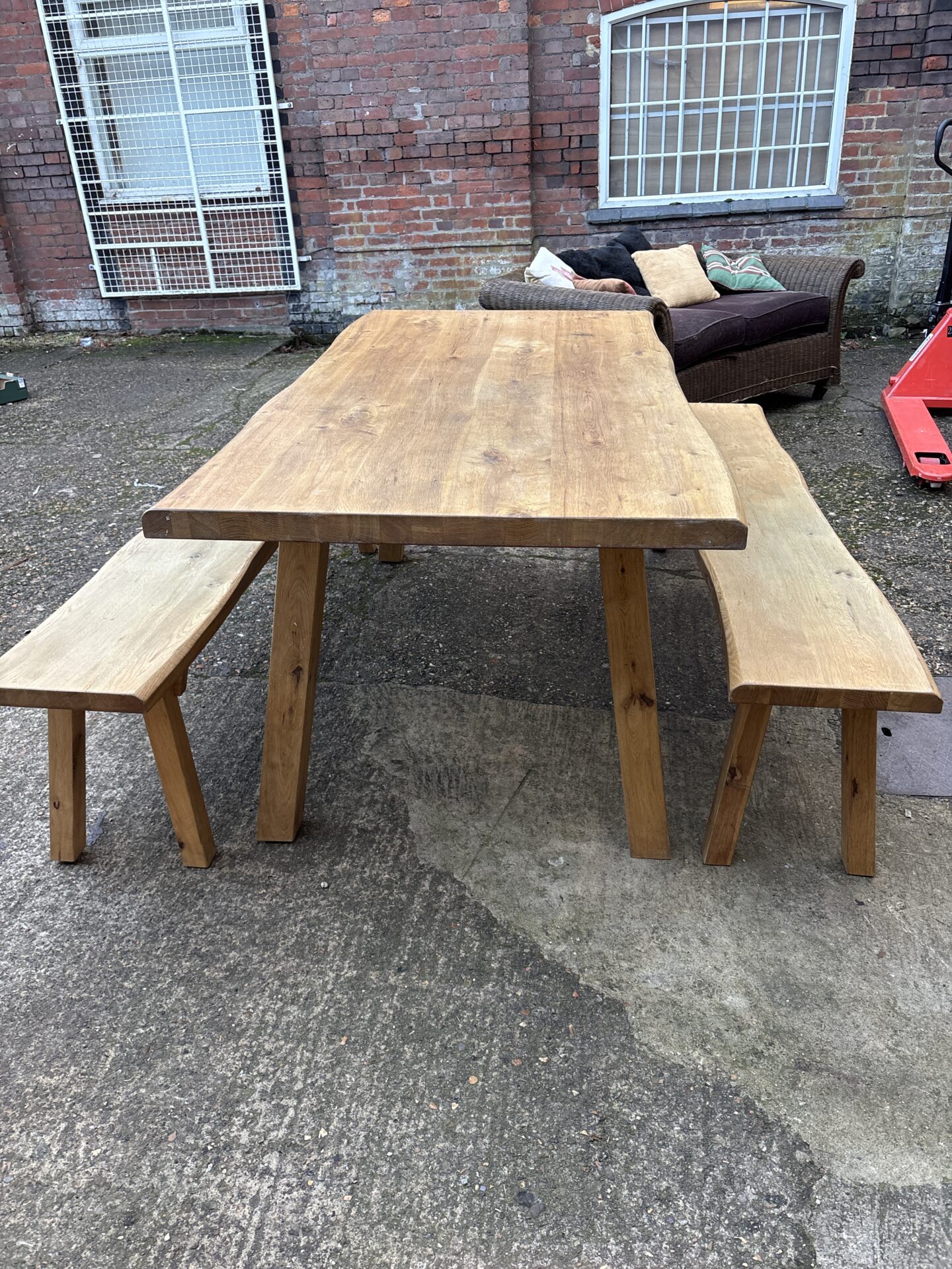 This substantial set comprises a large rustic oak table and matching benches, ideal for farmhouse or country-style interiors. The table and benches exhibit a natural, weathered aesthetic, showcasing the grain and character of the solid oak wood. The construction appears robust, suggesting a durable and long-lasting piece of furniture.