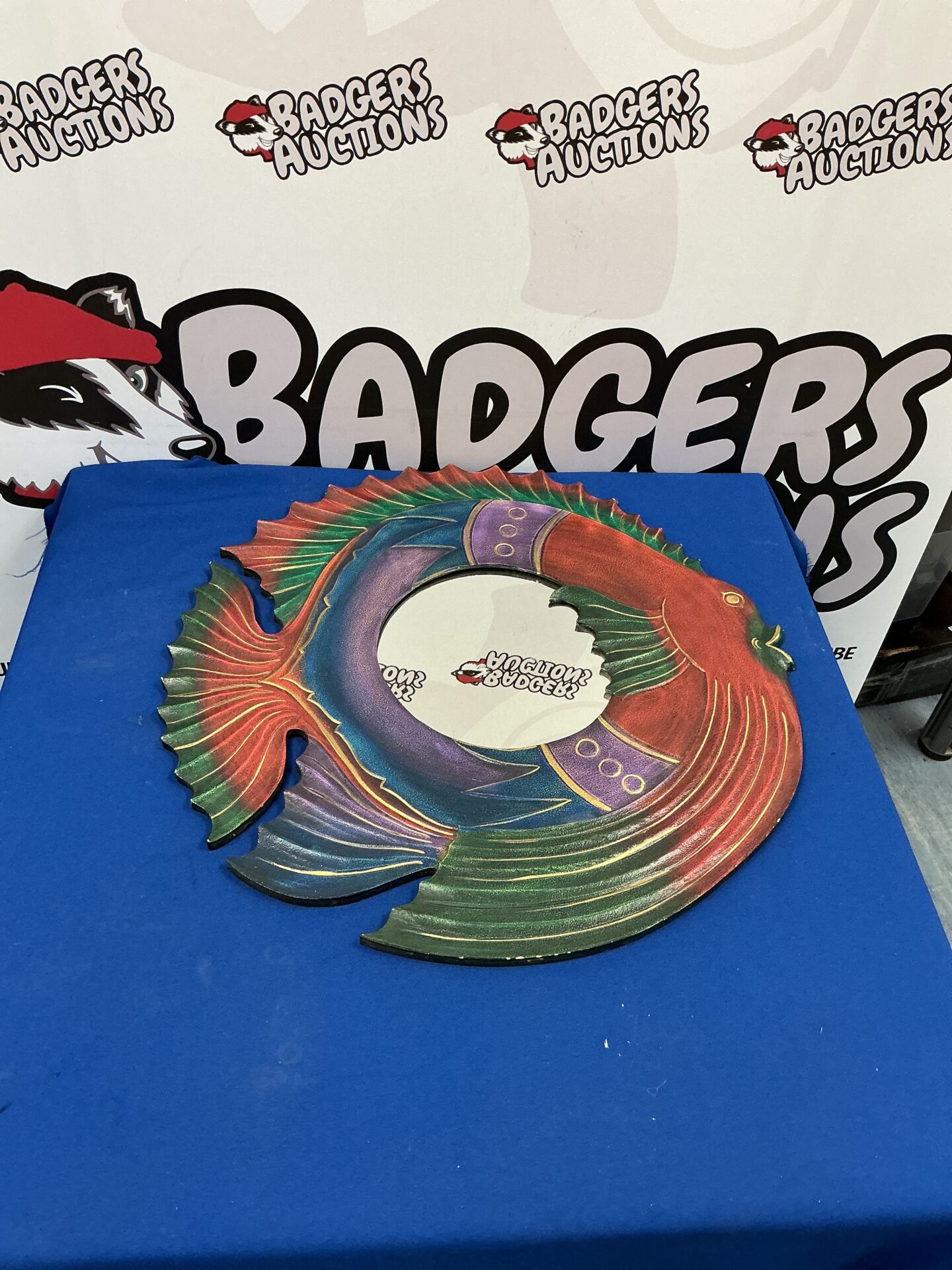 This large wall fish mirror is a vibrant and playful statement piece, perfect for adding a touch of mid-century modern or Hollywood Regency style to any room. Its unique fish shape and scale-like detailing make it a captivating focal point, reflecting light and creating a sense of spaciousness. A fantastic addition for collectors or those seeking a bold and artistic wall decor piece.
