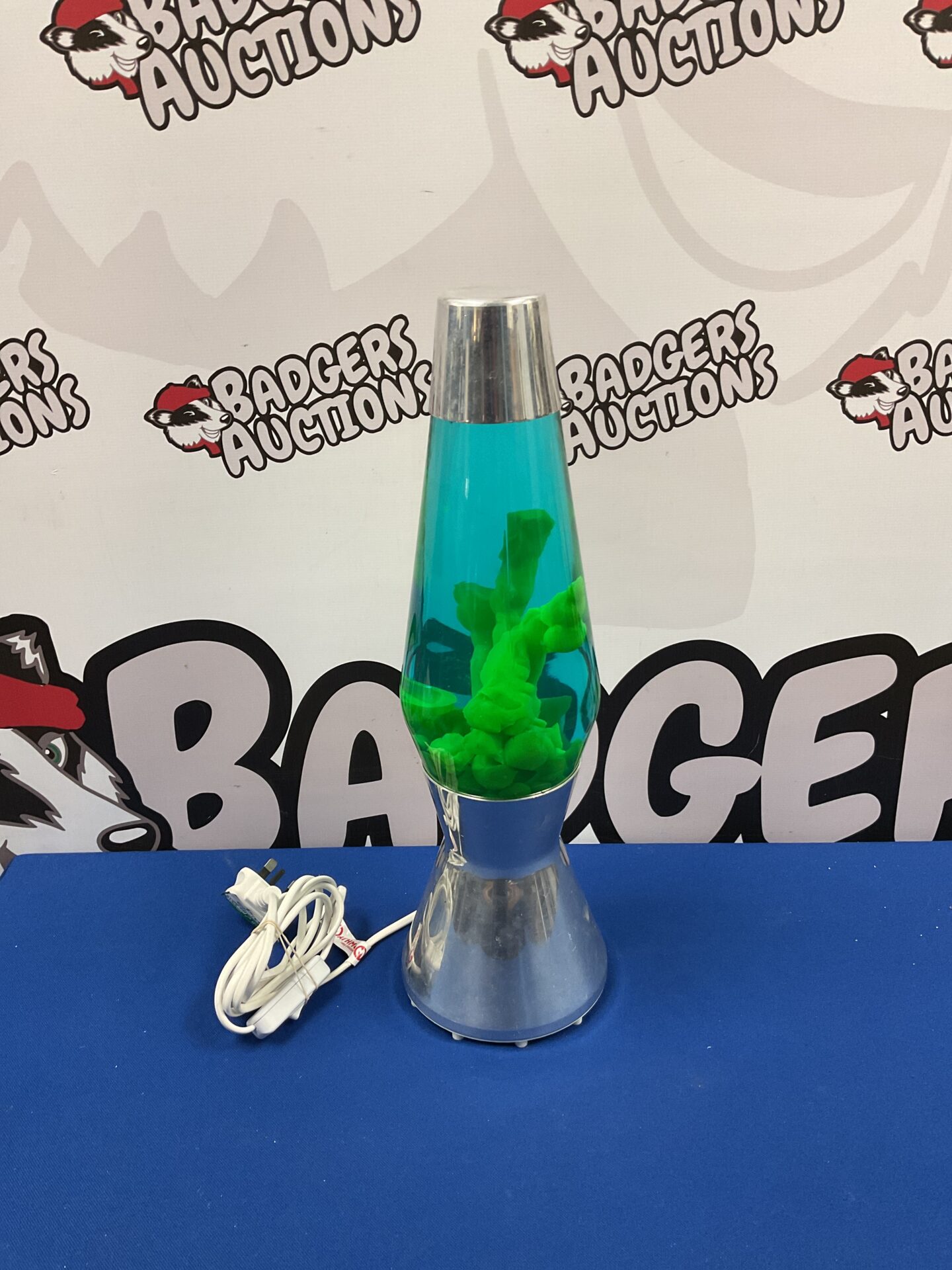 This is a large lava lamp featuring a classic design reminiscent of the 1960s and 70s. The lamp has a glass base and a tall glass cylinder containing wax and liquid, creating the iconic flowing lava effect when illuminated. Its vibrant green wax and clear liquid create a visually striking display, perfect for adding a touch of retro style to any room.