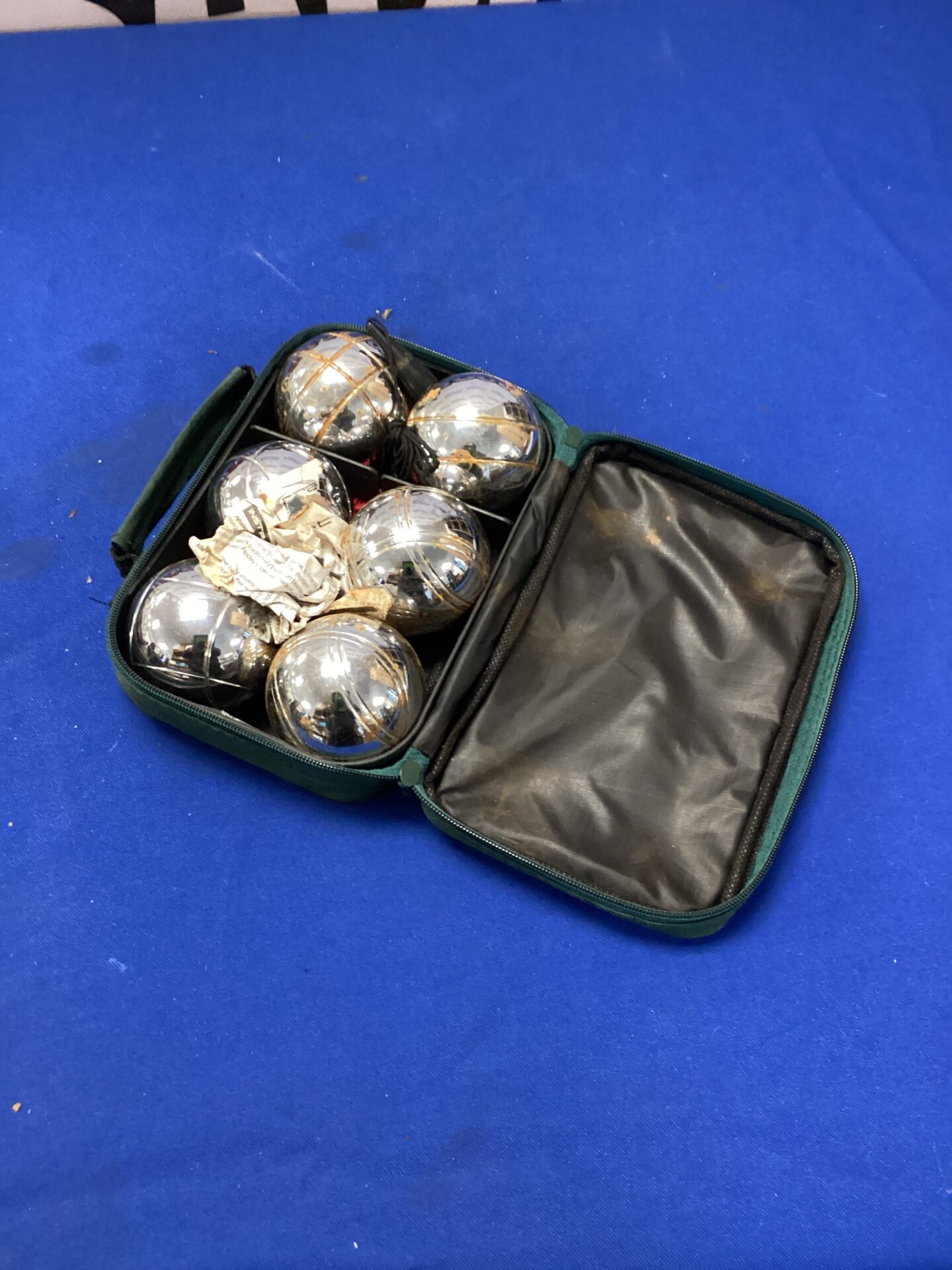 The bowls show signs of use, with some surface wear and minor scuffs consistent with outdoor play. The zippered pouch exhibits some fading and wear, but remains functional. This set would appeal to collectors of vintage sporting goods or those seeking a set of bowls for casual garden games.
