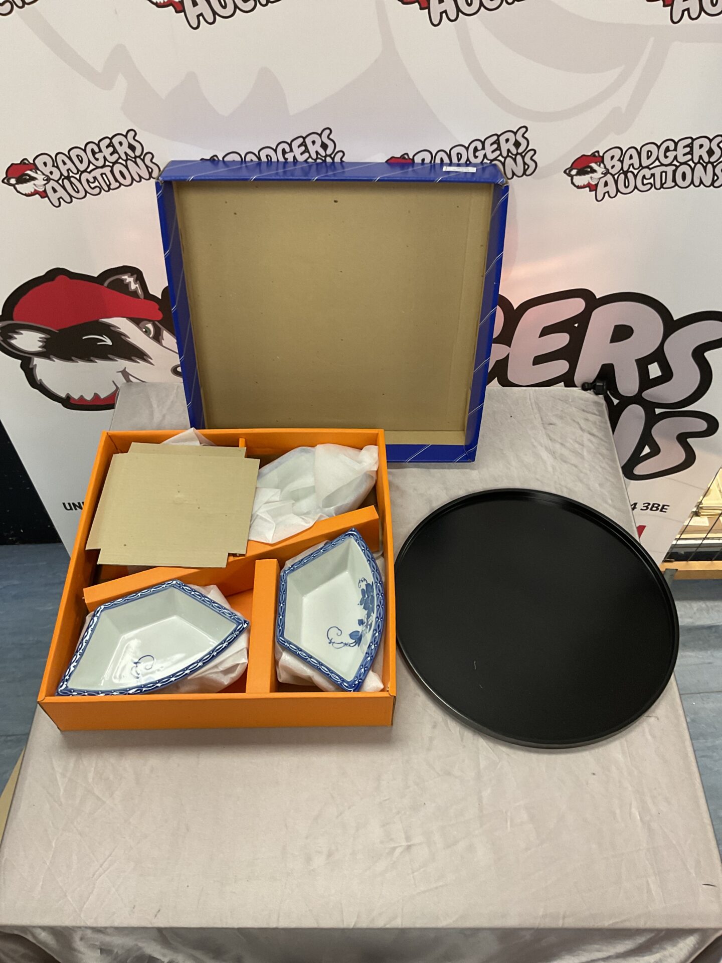 This lazy susan shows signs of wear consistent with age and use. It may have minor imperfections or blemishes, but these contribute to its character and vintage appeal. Collectors of blue and white china or vintage serving pieces may find this item particularly desirable.