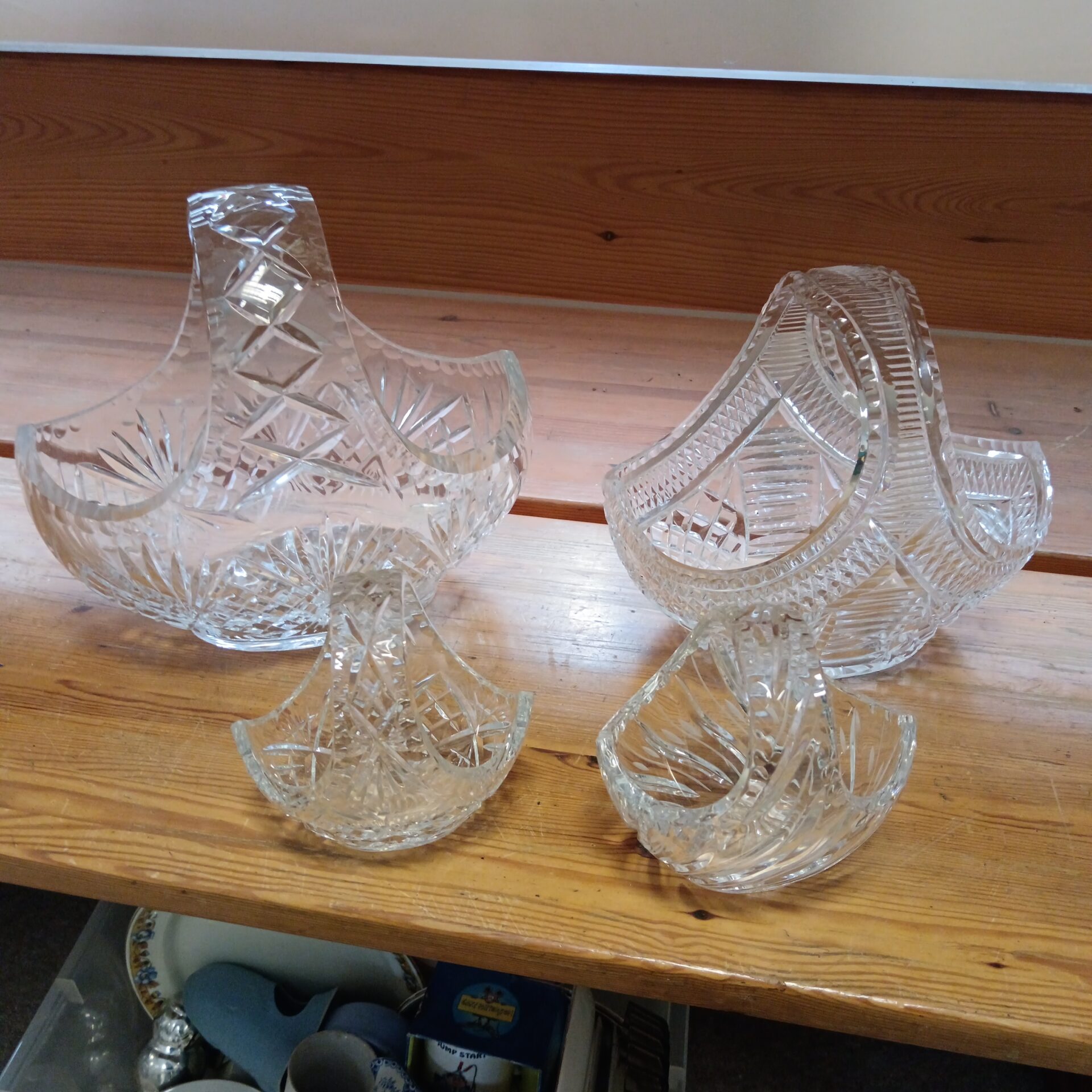 This lot comprises four intricately cut lead crystal baskets. The baskets exhibit a classic, floral-inspired pattern achieved through detailed craftsmanship. Their delicate construction and sparkling clarity make them ideal for display or as elegant serving pieces. The baskets are designed to showcase their beauty from all angles, with a refined aesthetic suitable for formal or decorative settings.
