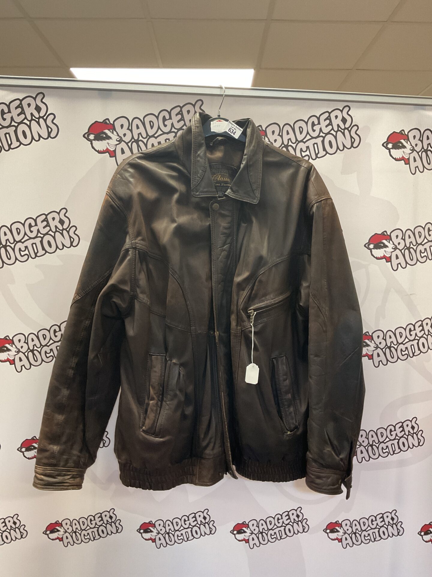This leather jacket shows signs of wear consistent with its age, adding to its character and vintage appeal. While showing some wear, it remains a desirable piece for collectors of vintage clothing or those seeking a classic leather jacket with a lived-in look. The jacket’s quality leather and classic style make it a potentially valuable addition to a collection or a stylish everyday wear item.