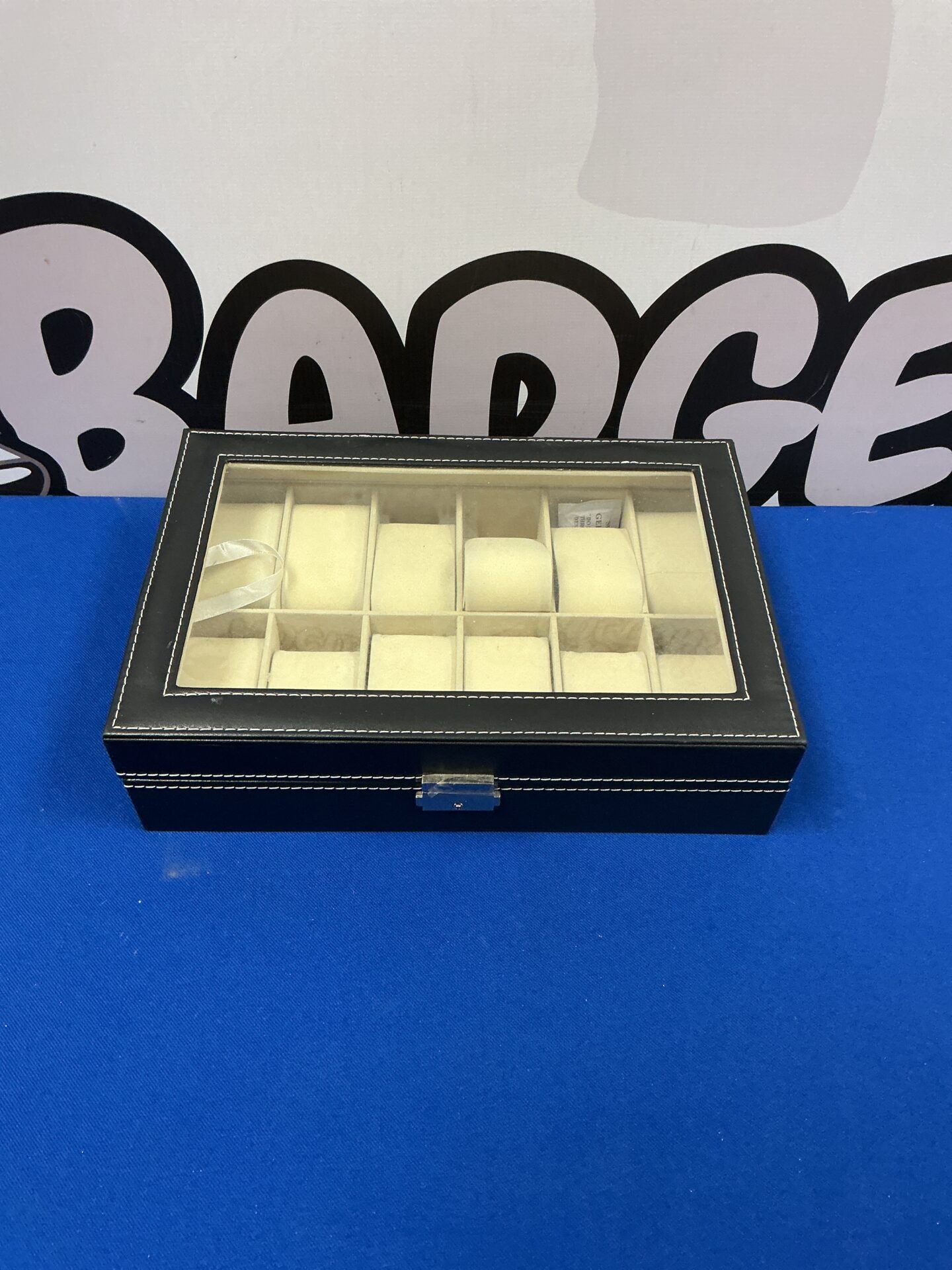 This is a leather watch display case, designed to showcase and store timepieces. The case features a glass lid allowing for easy viewing of the contents, and a rich leather exterior. It provides a secure and stylish way to protect and present a watch collection.