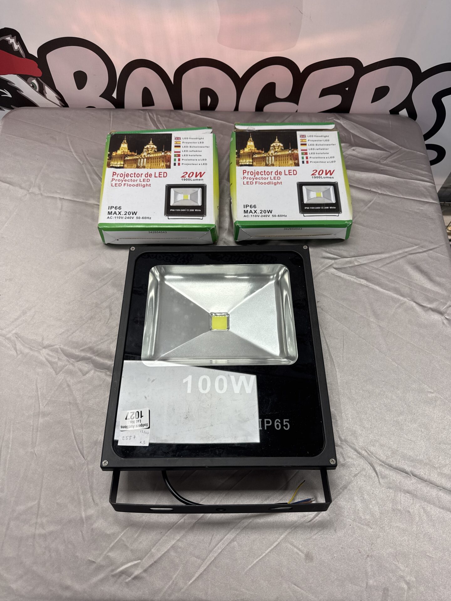 This lot comprises three robust LED security lights designed for outdoor use. There are two 20-watt IP66 rated lights, ideal for smaller areas, and one powerful 100-watt IP65 rated floodlight for larger spaces or enhanced security. These lights are designed to withstand the elements, providing reliable illumination for gardens, driveways, or commercial properties.
