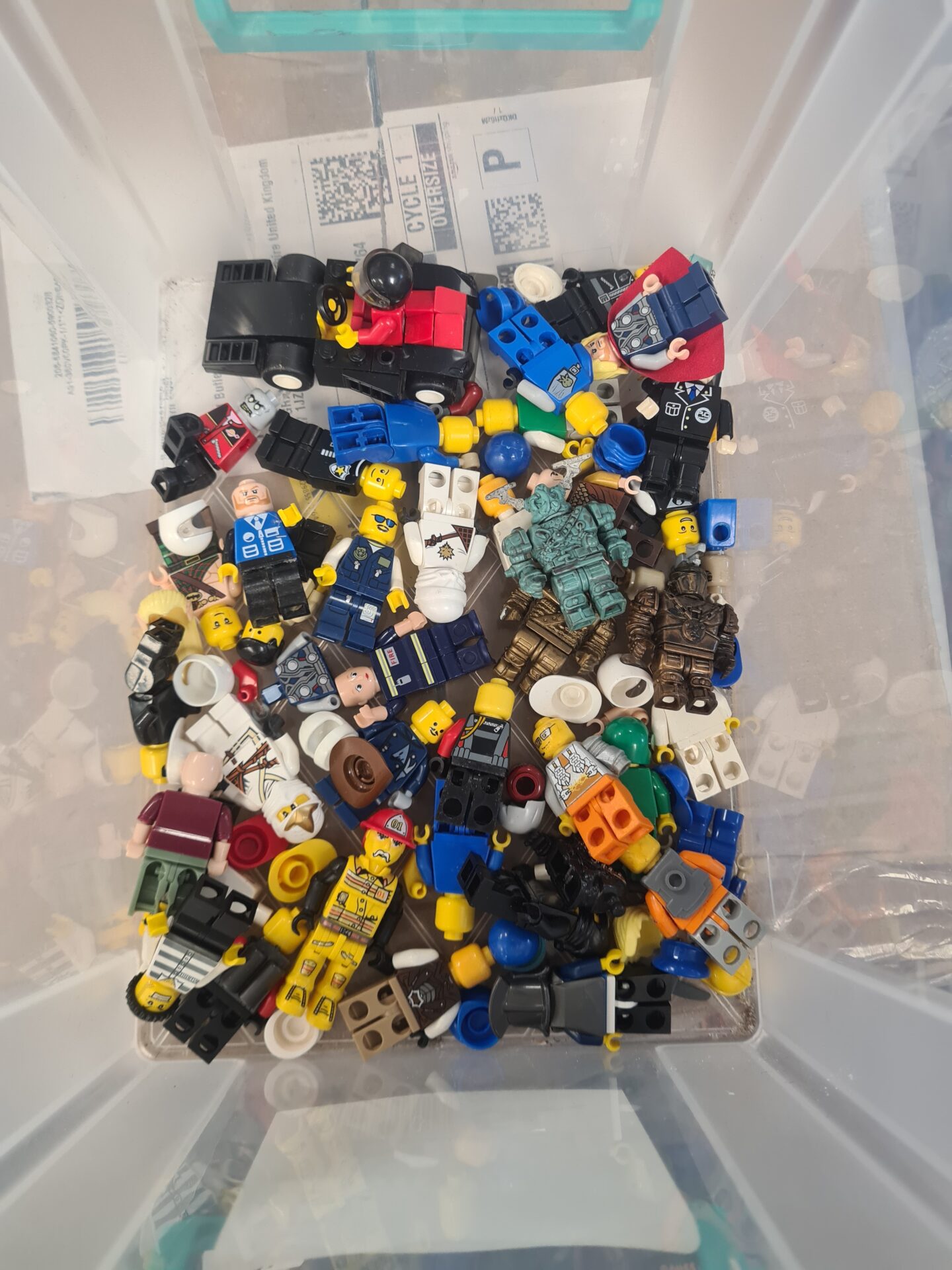 This is a substantial lot of Lego minifigures, including several from the popular Ninjago series. The collection features a diverse range of characters, colours, and accessories, offering a fantastic base for creative play or expanding an existing Lego world. The lot includes a variety of headgear, weapons, and body parts, allowing for customisation and endless possibilities.