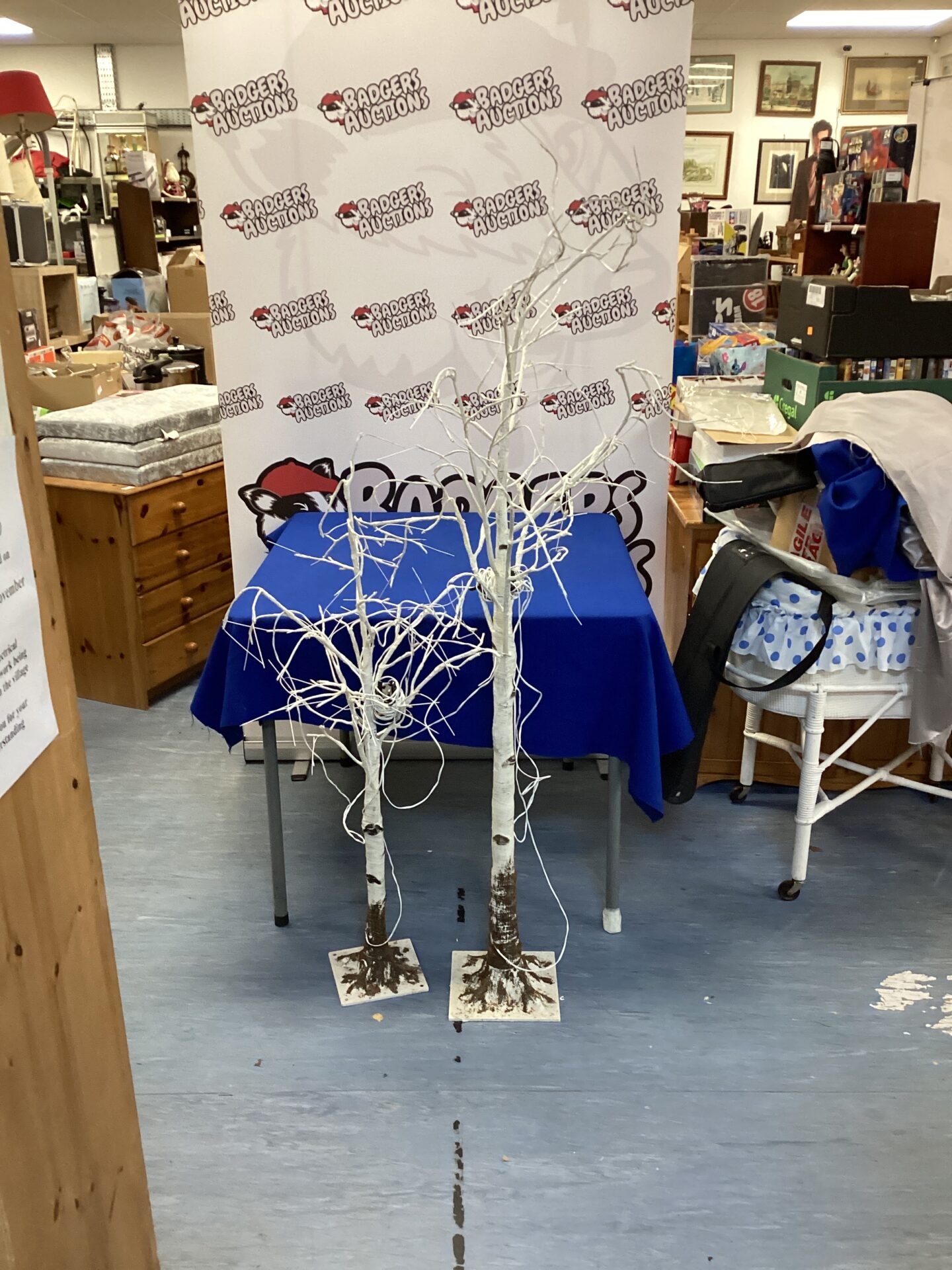 This lot features a pair of decorative Christmas trees designed to bring festive cheer to any space. These trees are constructed with slender branches, creating a minimalist and elegant silhouette. They are intended to be illuminated, offering a warm glow during the holiday season.