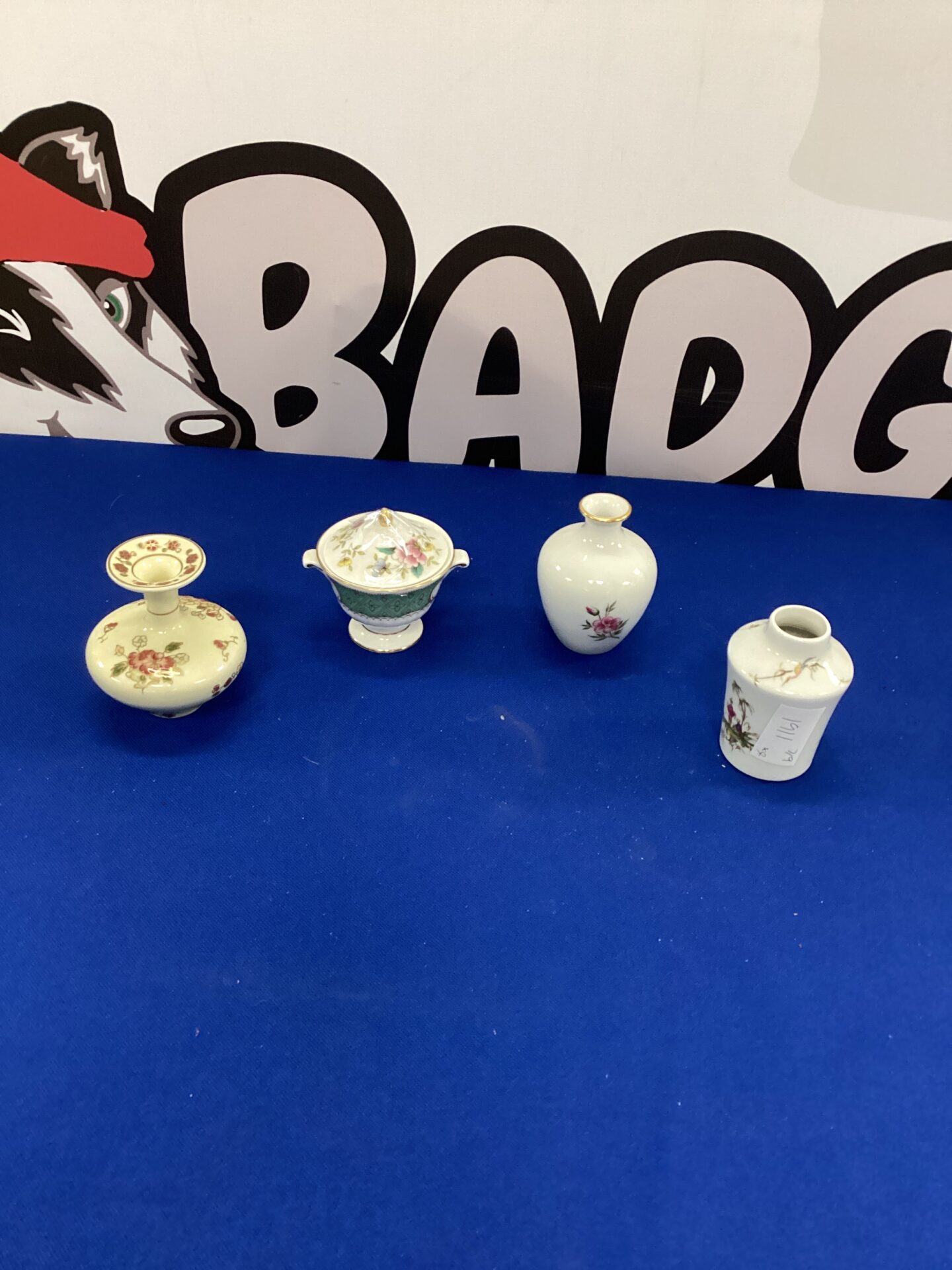 This charming lot comprises four miniature vases crafted from delicate Limoges porcelain. Each vase features a classic shape and is adorned with hand-painted floral motifs, showcasing the renowned artistry of Limoges porcelain production. These vases are perfect for displaying small floral arrangements or as standalone decorative pieces, adding a touch of French elegance to any setting.