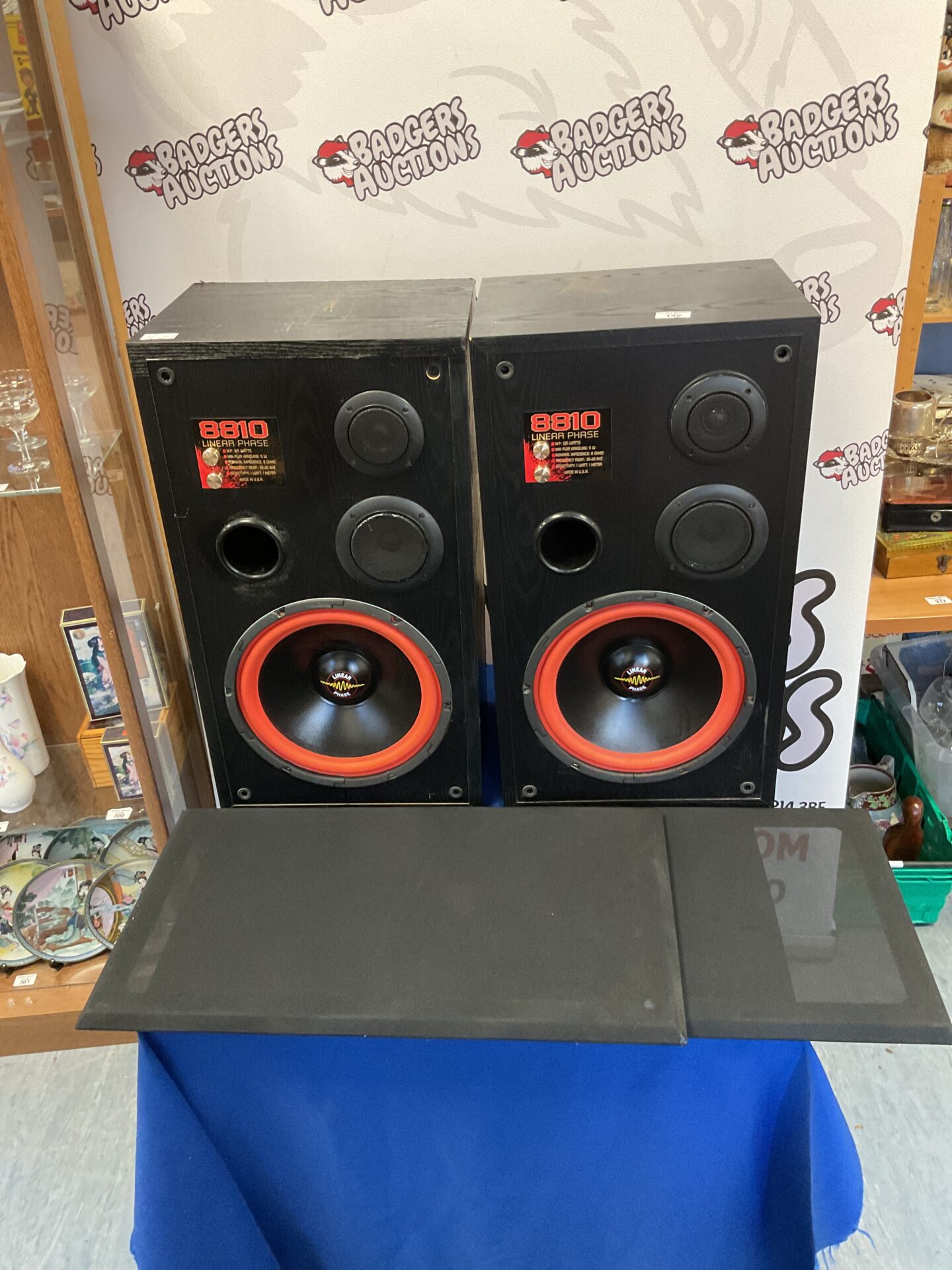 These are a pair of Linear Phase 8810 loudspeakers. These speakers feature a classic design, likely from the 1980s, and are constructed with a wood veneer finish. The front panel features a prominent driver arrangement, suggesting a focus on delivering clear and balanced audio reproduction.