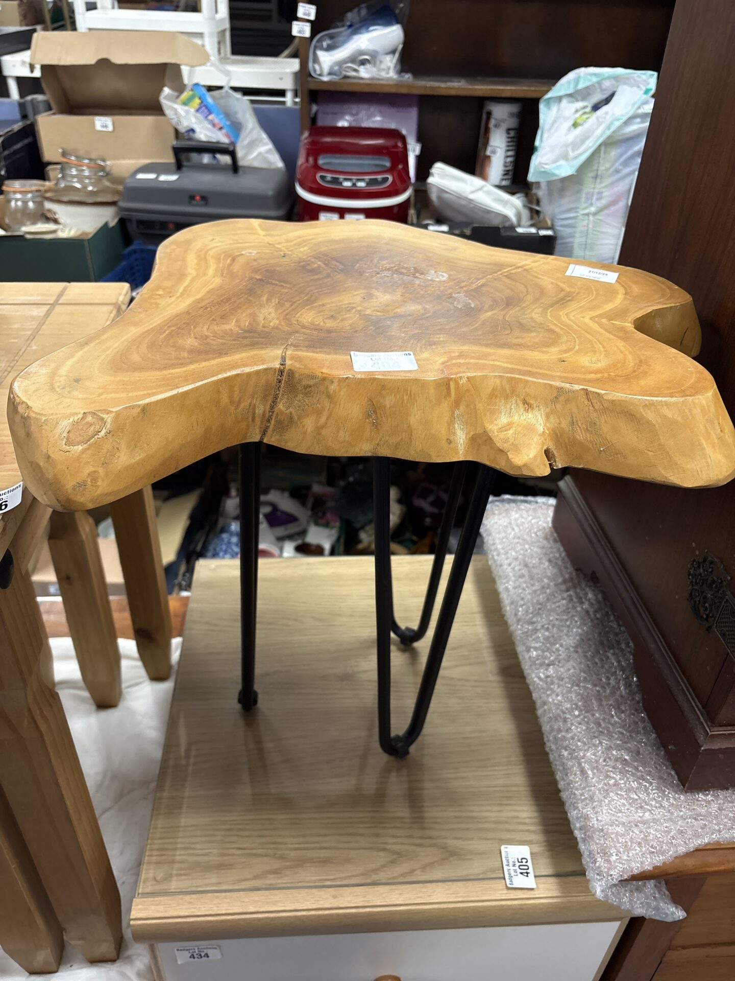 This is a striking live edge side table, crafted from a single slab of wood, showcasing its natural, organic form. The table features a unique, irregular edge, highlighting the wood’s inherent beauty and character. Supported by sleek, hairpin-style metal legs, this table blends rustic charm with a modern aesthetic, making it a versatile addition to any living space.