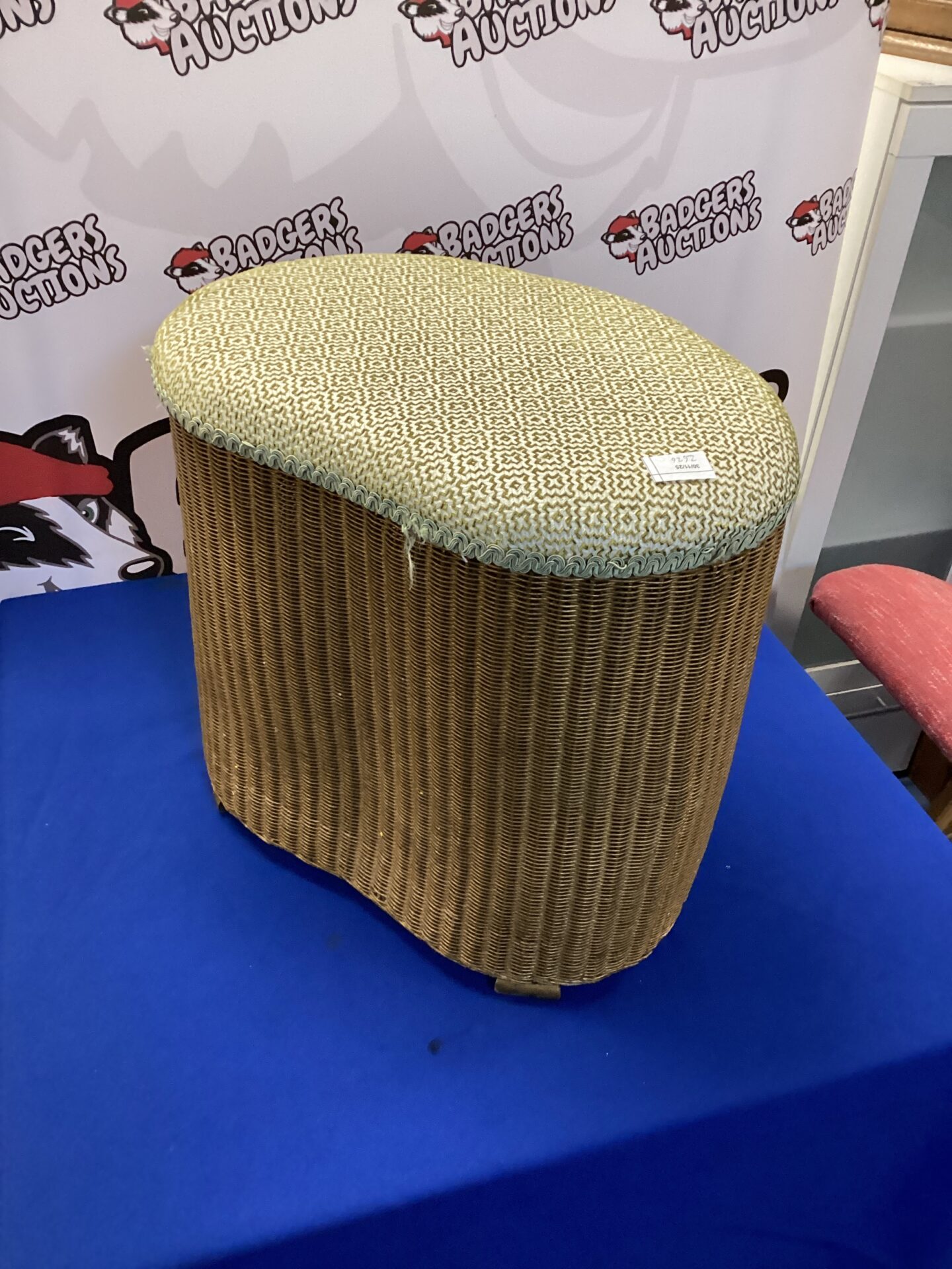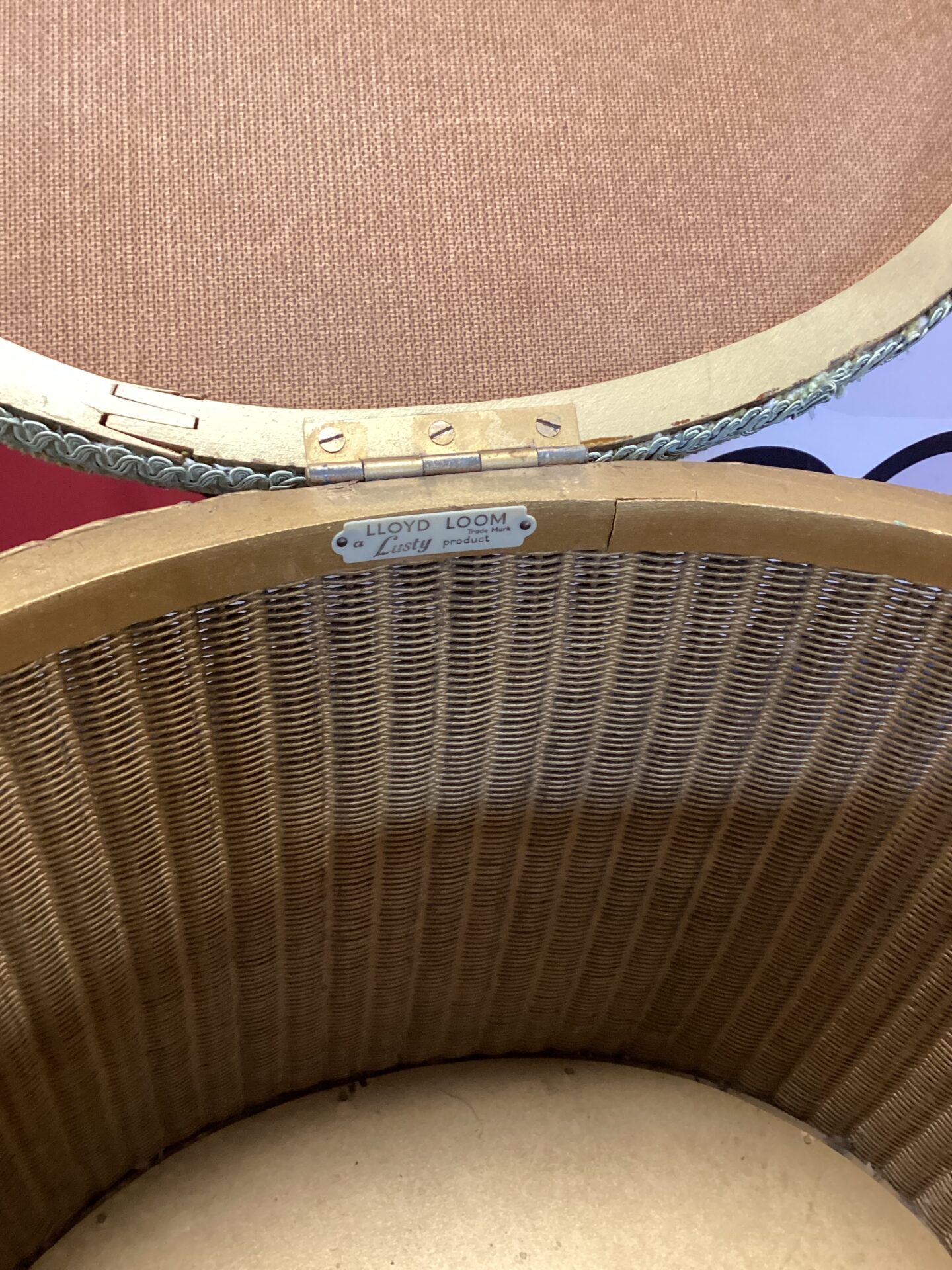 This Lloyd Loom wash bin shows signs of age and use, consistent with its vintage nature. The woven material exhibits some wear and minor imperfections, adding to its character. Collectors appreciate Lloyd Loom for its unique construction and enduring style, making this bin a desirable addition to any vintage home decor collection.