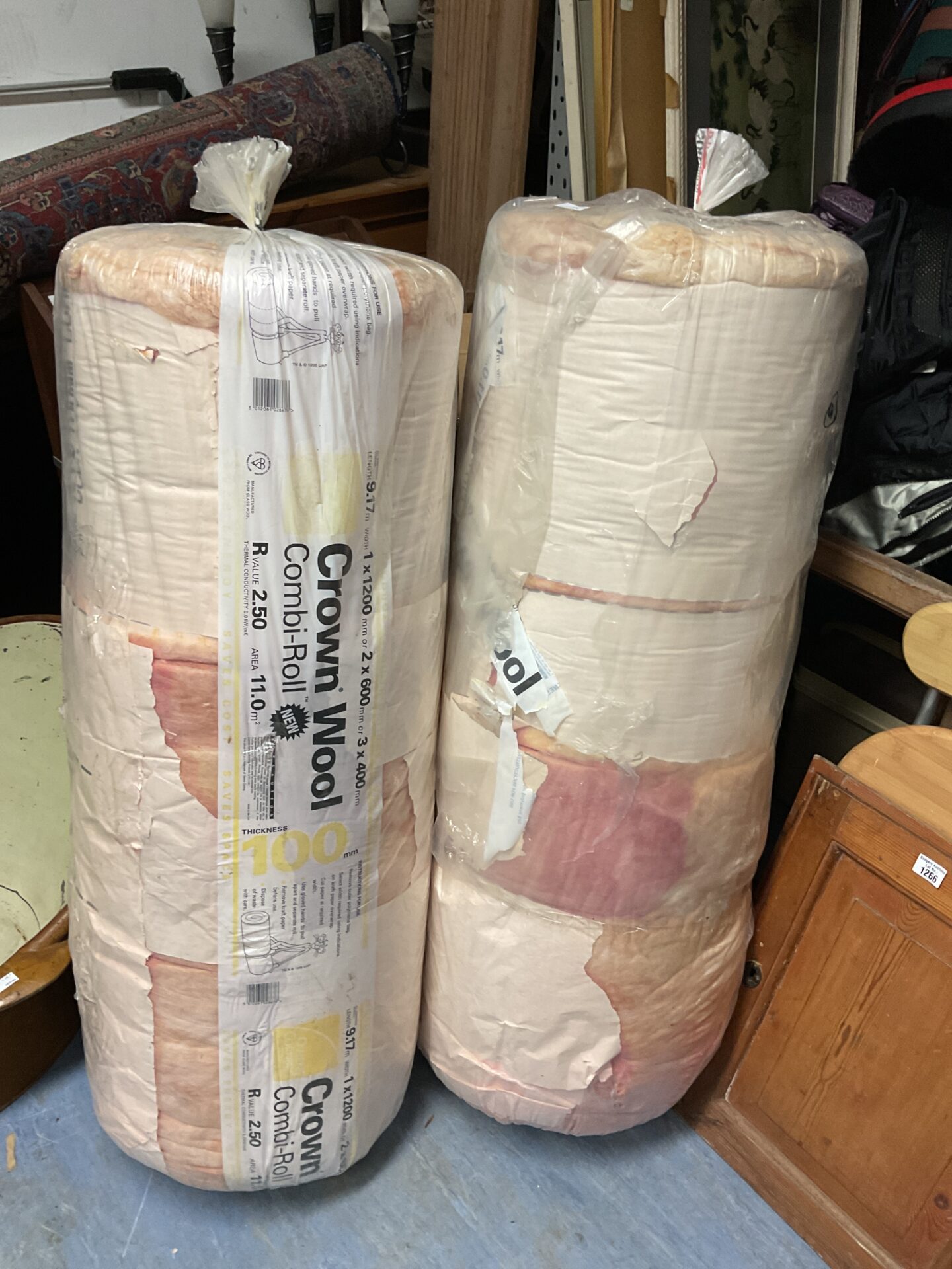 These are two rolls of loft insulation, designed to provide thermal and acoustic insulation for lofts and attics. The rolls appear to be made from mineral wool, a common material for this purpose, and are intended to be laid between or over joists to reduce heat loss and improve energy efficiency. The rolls are substantial in size, suggesting they can cover a significant area.
