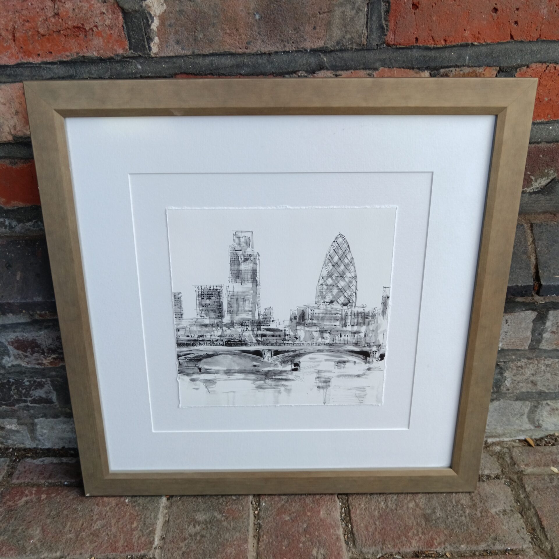 This is a framed print depicting a London city view. The print appears to be from the 20th century, showcasing a classic depiction of the city’s skyline. The style is reminiscent of mid-century graphic design, with a focus on line and form. The print is presented behind glass within a simple frame, enhancing its visual appeal.