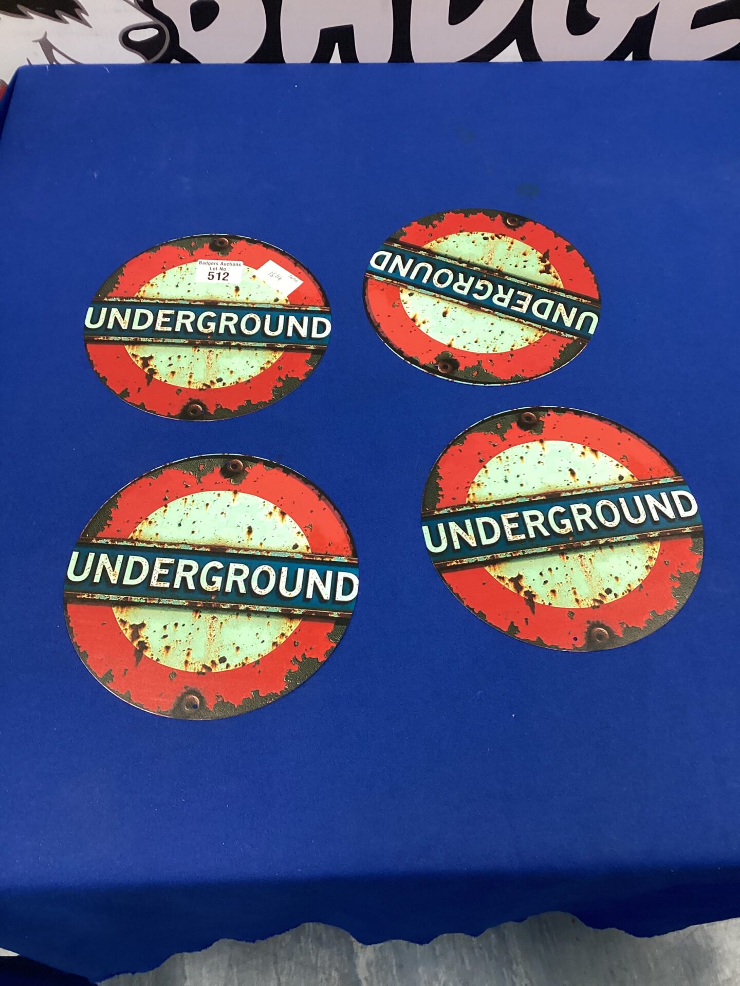 This lot comprises four original tin wall signs from the London Underground. These iconic signs, featuring the distinctive roundel design, were likely used for directional or informational purposes within the stations. The signs exhibit the classic red, white, and blue colour scheme synonymous with the Underground, and their robust construction suggests they were intended for long-term use in a public environment.
