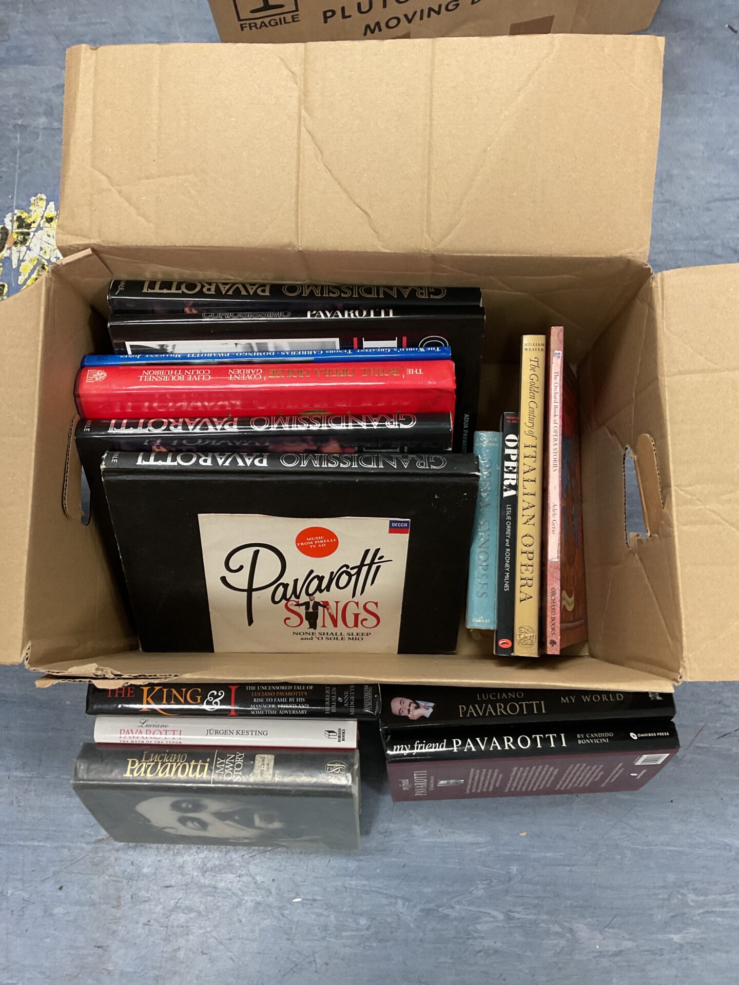 The books and vinyl appear to be in good condition, though a detailed inspection would be necessary to assess any specific wear or damage. This collection would appeal to fans of Luciano Pavarotti, opera enthusiasts, and collectors of music memorabilia and biographies. The inclusion of a vinyl record adds to the collectibility and value of this lot, offering a tangible piece of musical history.