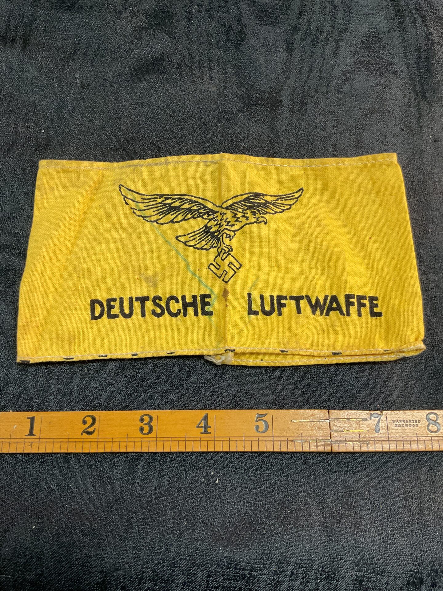 This is a printed cloth armband associated with the German Luftwaffe during World War II. The armband features a printed design, likely indicating a specific role or unit within the Luftwaffe. These armbands were used to identify personnel and denote their function, contributing to the organisation and efficiency of the German air force during the war.
