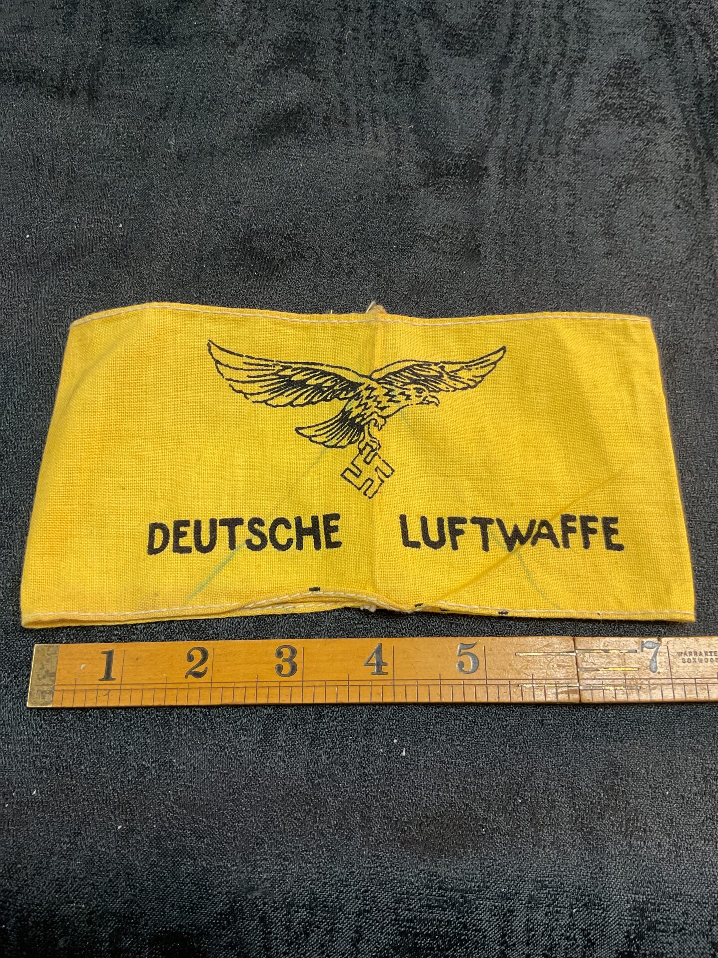 This armband shows signs of age and wear consistent with its likely wartime use and subsequent history. While showing wear, it remains a potentially interesting item for collectors of WWII military memorabilia or those interested in the history of the Luftwaffe. The armband’s originality and historical context make it a desirable piece for display or further research.