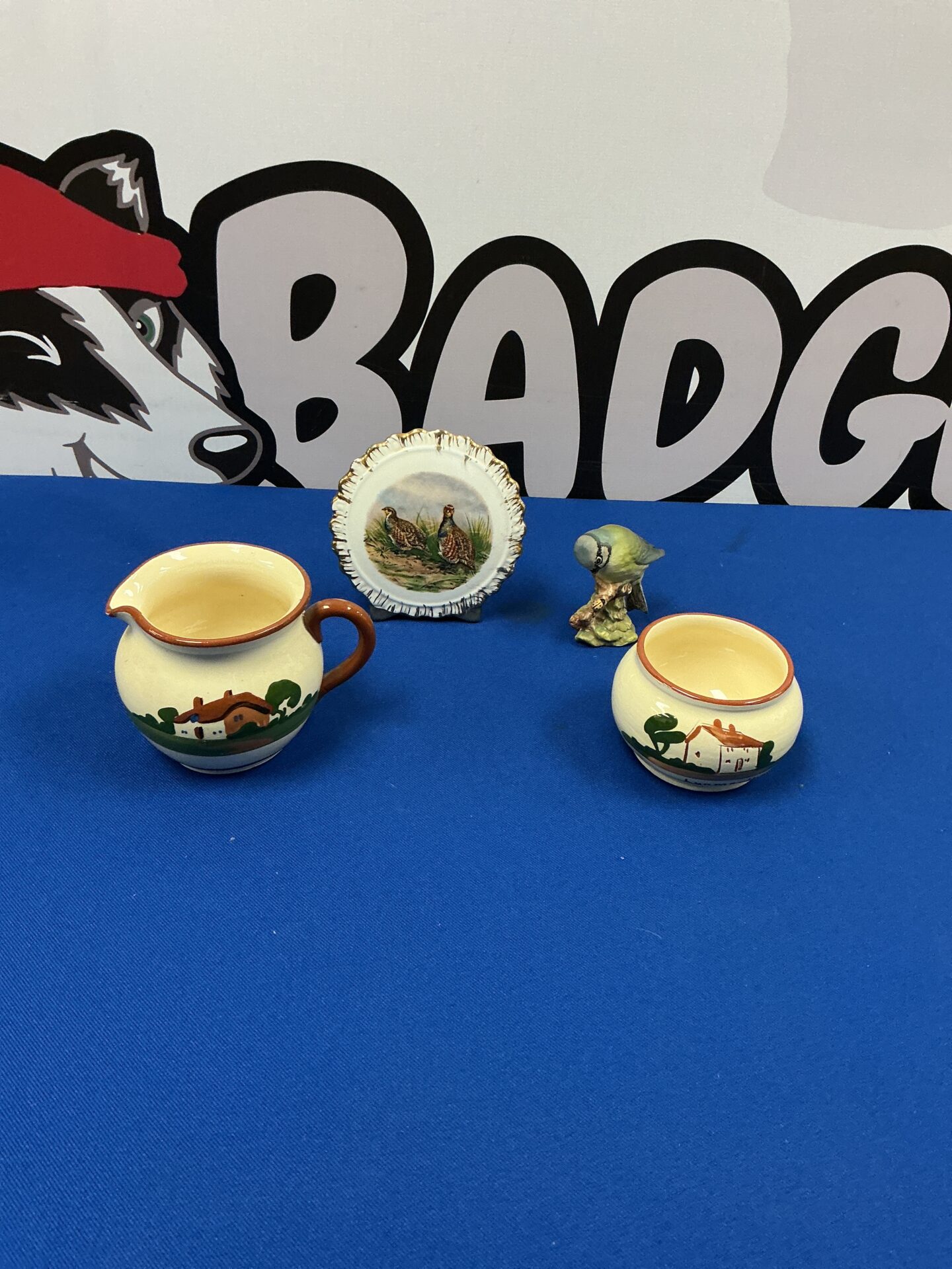 This charming set comprises a milk jug and sugar bowl crafted by Lynmouth Pottery, alongside a delicate Beswick bird figurine. The pottery pieces feature a classic farmhouse style, with a warm cream glaze and hand-painted floral detailing. The Beswick bird adds a touch of whimsy and complements the rustic aesthetic of the pottery, creating a delightful ensemble for collectors or those seeking a touch of vintage charm for their home.