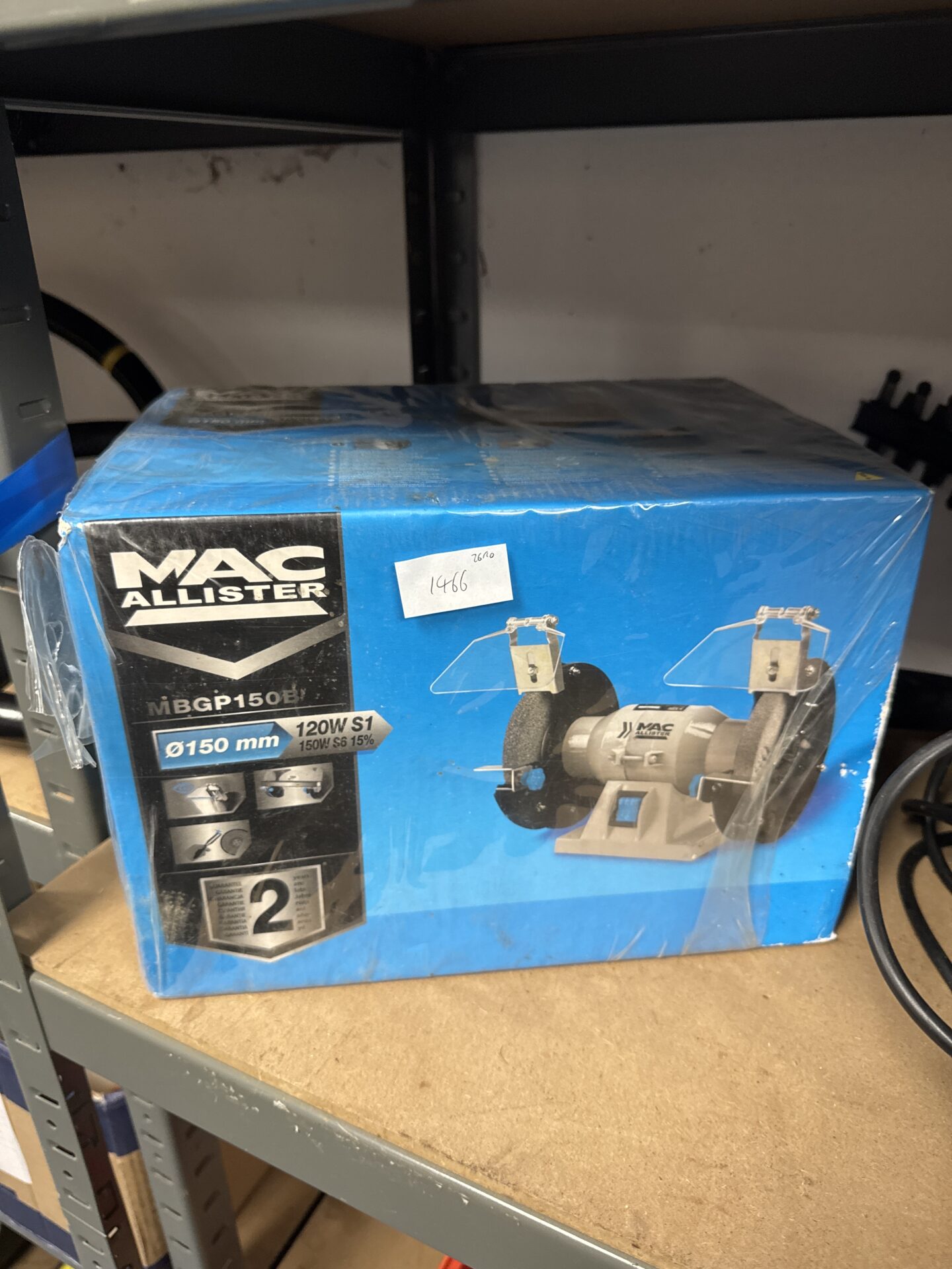 This is a new, boxed Mac Allister MBGP150B bench grinder. A versatile power tool for sharpening, grinding, and shaping materials, it’s ideal for workshops and DIY projects. Presented in original packaging, this grinder is a great find for tool collectors or those needing a replacement.