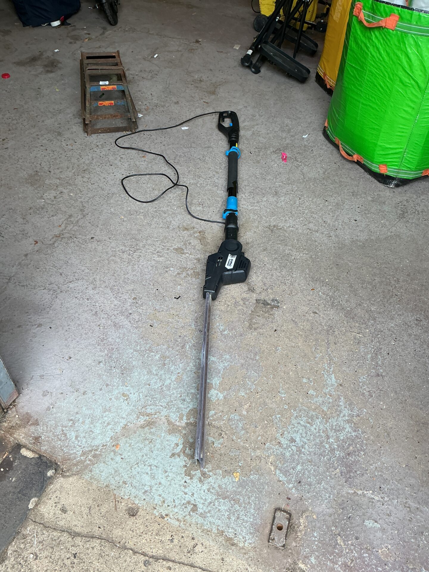 This is a Mac Allister pole hedge cutter, designed for reaching high hedges and shrubs without the need for a ladder. It features an electric motor and a long pole for extended reach, making it ideal for maintaining gardens with tall hedges. The cutter head is designed for efficient trimming, and the pole allows for adjustable angles to tackle various hedge shapes and sizes.