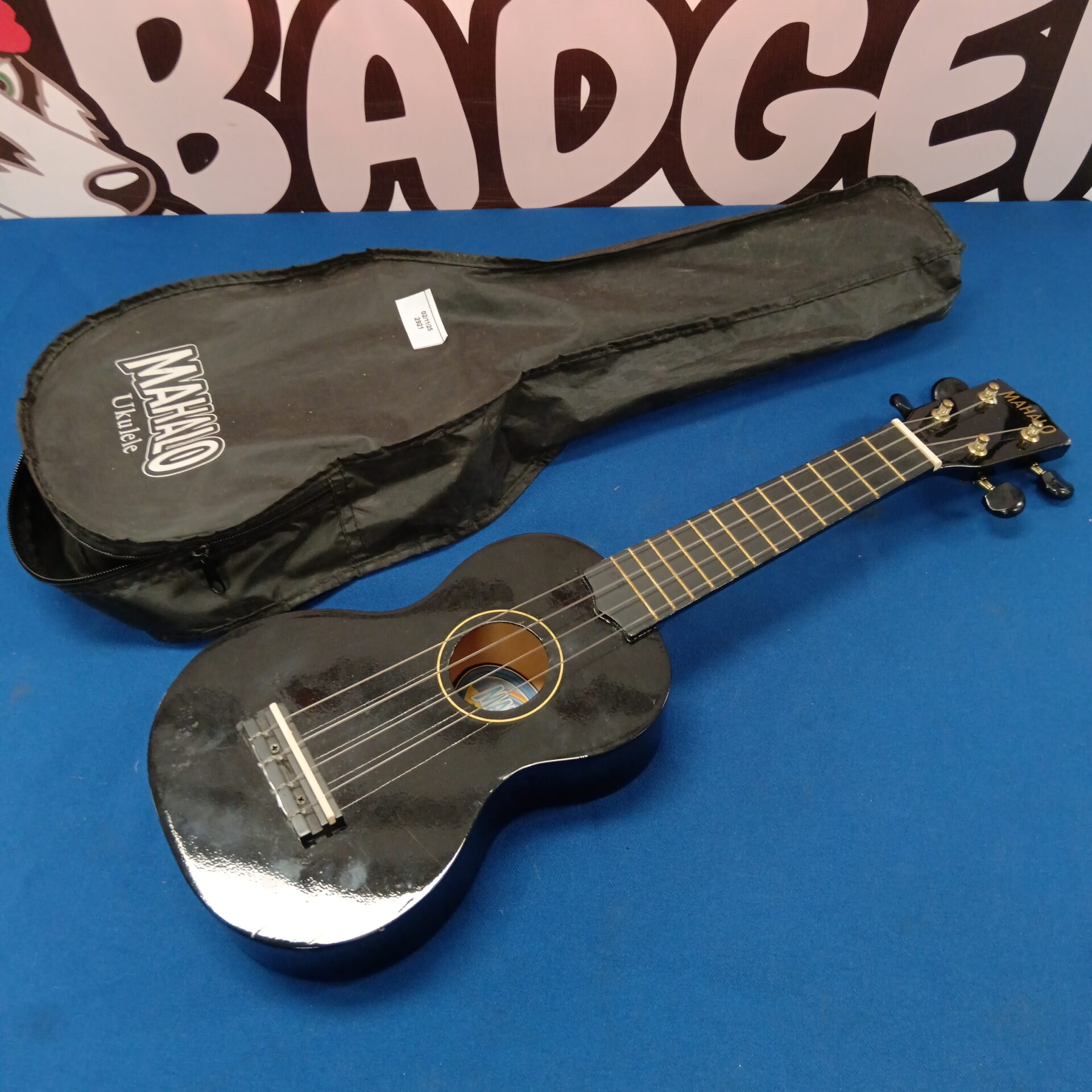 This is a Mahalo U30G soprano ukulele, a popular choice for beginners and enthusiasts alike. It features a durable construction and is designed to produce a bright, cheerful sound. The ukulele is black in colour and comes with a protective case for storage and transport.