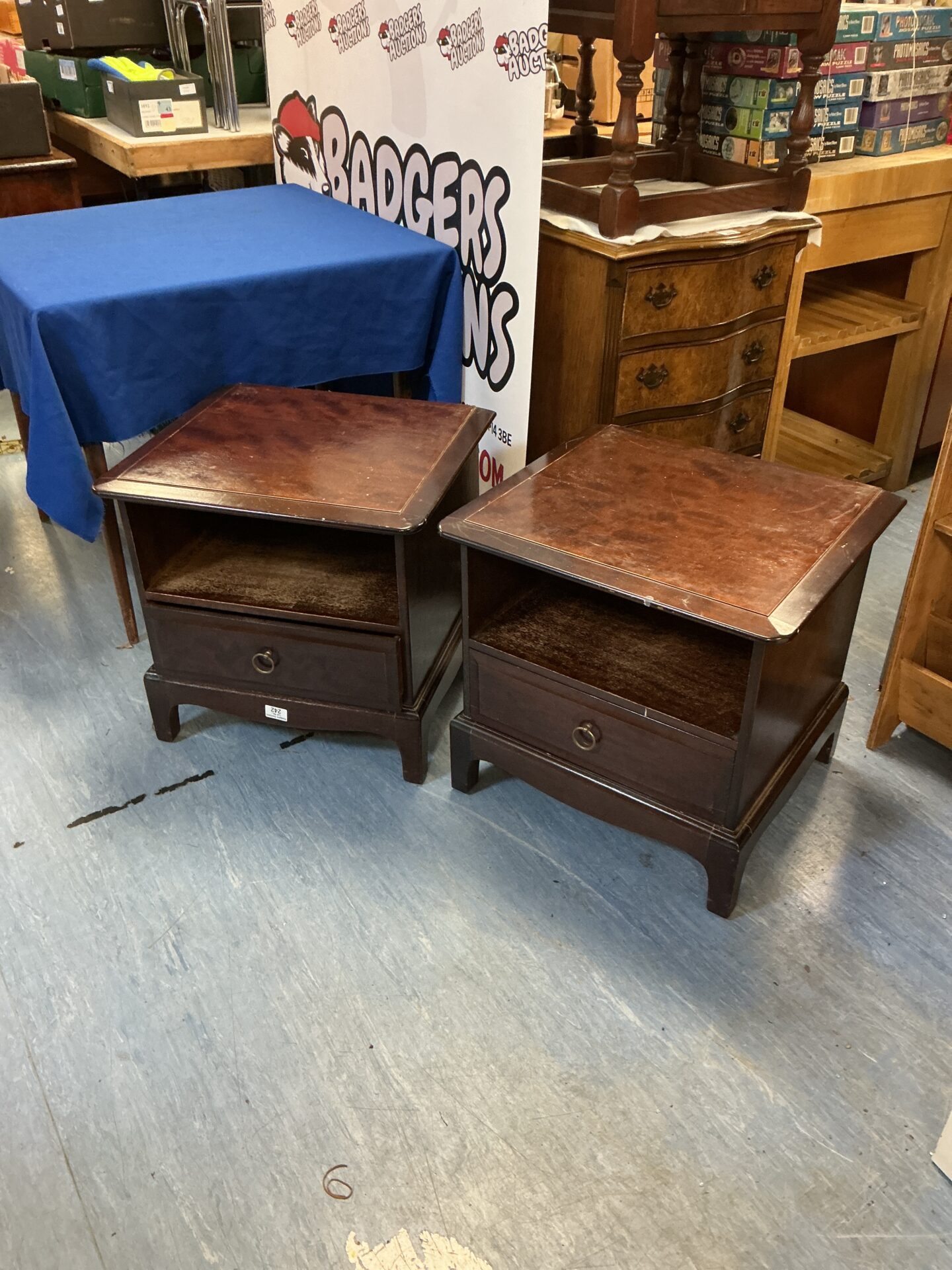 These are a pair of handsome mahogany bedside cabinets, measuring 20”x19”x21”. The cabinets feature a single drawer above a cupboard space, offering practical storage solutions for a bedroom setting. The warm tone of the mahogany and classic design would suit a variety of interior styles, from traditional to contemporary.