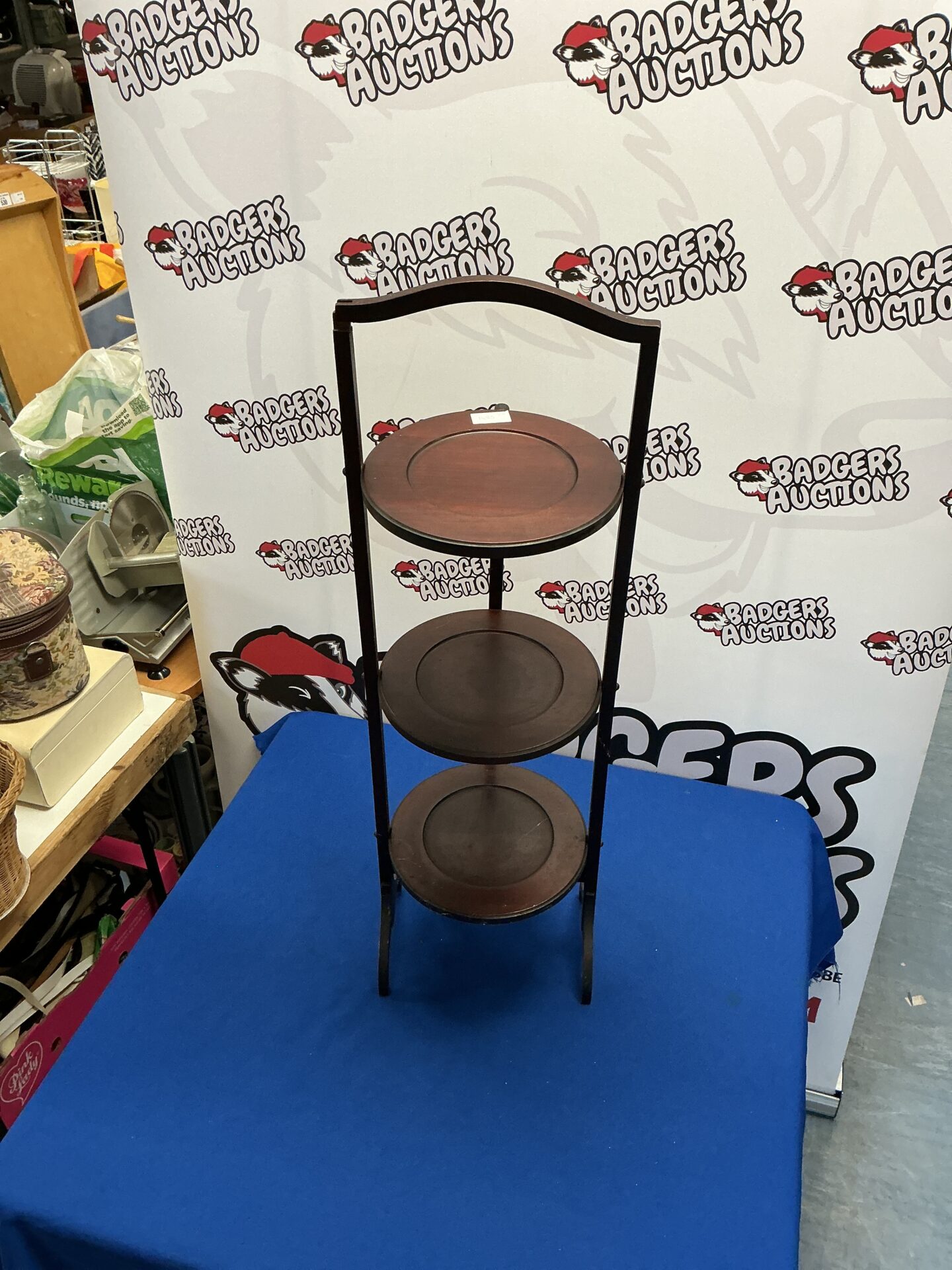 This is a handsome mahogany folding three tier cake stand. The stand features a rich, dark wood finish and a classic design, ideal for displaying cakes, pastries, or other treats. Its folding design allows for easy storage when not in use, making it a practical and elegant addition to any kitchen or dining space.