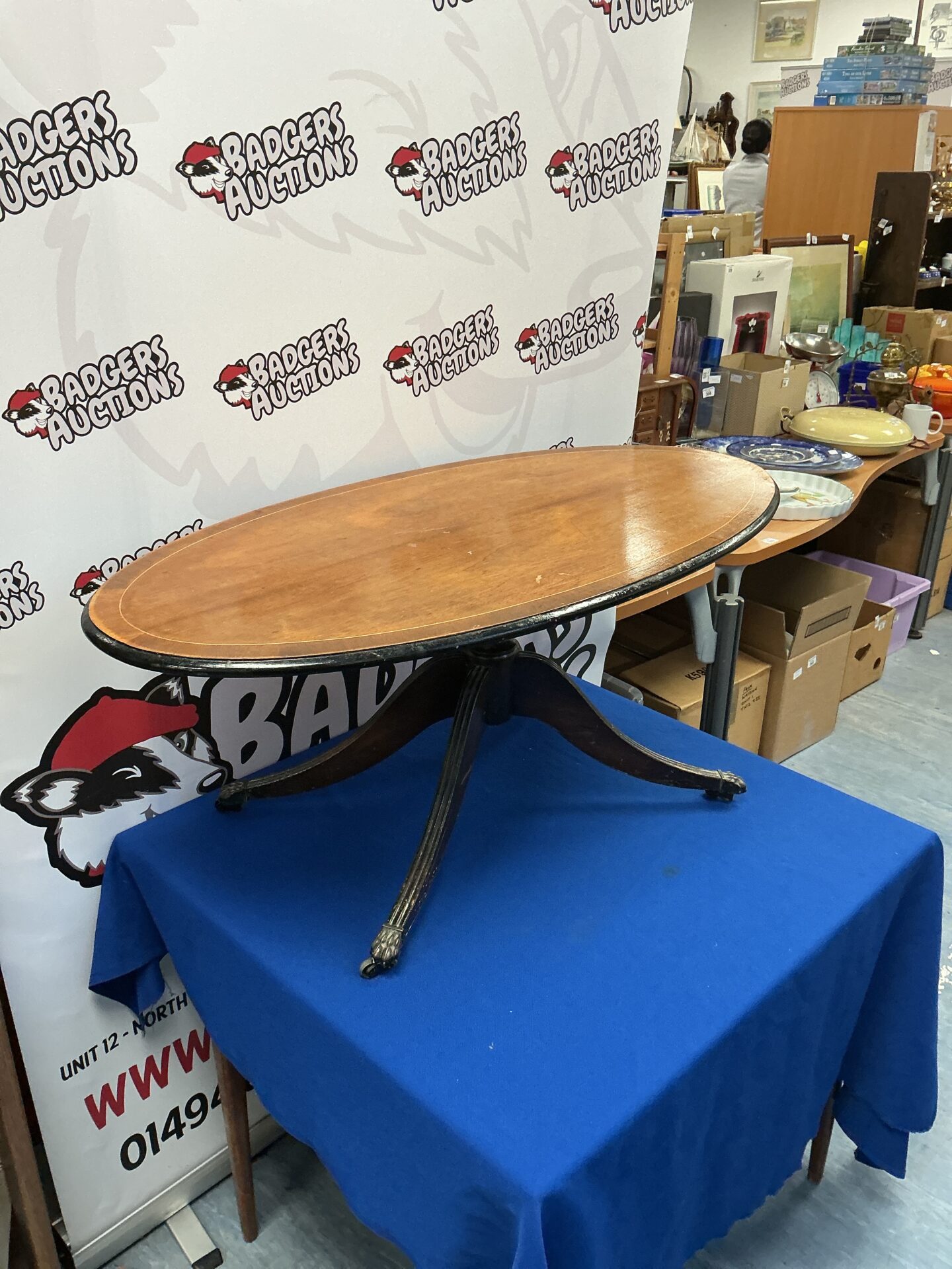 This is a beautifully crafted mahogany coffee table, featuring an oval shape and intricate inlaid detailing. The table stands on metal claw casters, adding a touch of elegance and allowing for easy movement. The warm tones of the mahogany and the detailed inlay work make this table a standout piece for any living space.